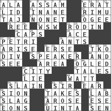 ACROSS 1. According to 4. Indian state 9. Part of Q.E.F. 13. Hat (slang) 14. Silly 15. Tall New Zealand timber tree 16. _ Mahal 17. Music written for nine 18. Double curve, resembling the letter S 19. To riddle 21. Compass dir. 22. "The Thinker" sculptor 24. Smile enhancers 26. Adept person 27. _ dish (used to culture cells) 29. Pismires 30. Originate 31. Celtic language 33. Ring climax 36. HTML Container Element 37. Orator 40. Also 41. Observe 42. Length times width 43. Stared 45. Municipality 47. Falsehoods 48. Falsehood 49. Electrical Unit 50. Killed 52. Title for a knight 54. Hearing organ 56. The Jewish people; Israel 57. Receives possession of 59. Experiment locale 61. Volcanic refuse 62. Came up 63. Compass dir. 64. Immeasurably long periods of time 65. National forest in Provo, Utah 66. Elected rep. DOWN 1. Keyboard modifier key 2. One who doesn't tell the truth 3. Descriptive word 4. The 18th letter of the Arabic alphabet 5. Frozen precipitation (plural) 6. Without 7. Afresh 8. Was introduced to 9. Eats (away) 10. Swiss mountan, "Queen of the Mountains" 11. So be it 12. Third day of the wk. 20. Hearing organs 22. Indian princess (variant) 23. Sep. follower 25. Sliced desserts 27. Groovy apts. 28. 4th largest of the Great Lakes 29. "____ silly question..." 31. Suggestive of the supernatural 32. Actress Charlotte 33. Baron Munchausen's specialties 34. Leg joint 35. Likelihood 38. Eucharist need 39. Roll call or roster of names 44. Yard entry 45. Gives out a loud, resonant sound 46. One more than two 49. Obtain by seizing forcibly or violently 50. Grain storage tower 51. Grant temporary use of 52. Indian skirt 53. Picture 55. Raze (variant) 56. Compass dir. 57. The 19th letter of the Greek alphabet 58. Ocean 60. Benjamin's nick name