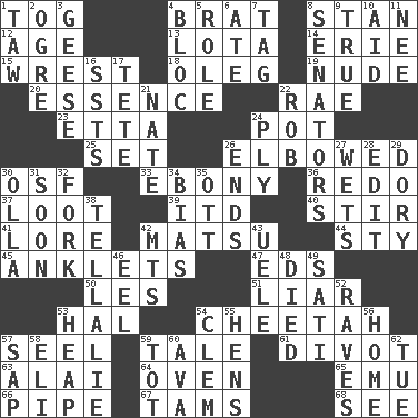 ACROSS 1. Coat; cloak 4. Naughty child 8. Comedian Laurel of Laurel & Hardy 12. Ripen 13. Globular water bottle used in Asia 14. 4th largest of the Great Lakes 15. Take or capture by force 18. Cassini of fashion 19. Unadorned 20. Gist 22. Actress Charlotte 23. Singer James 24. Cooking vessel 25. Arrange properly for use 26. Turned at an angle; bent 30. Order of Saint Francis (abbr.) 33. Dark wood 36. Do over again 37. Spoils 39. It would 40. Use a spoon 41. Old wives' tales, e.g. 42. Taiwanese island in East China Sea 44. Filthy place 45. Short socks 47. Begley and Asner 50. French article 51. One who doesn't tell the truth 53. Actor Linden 54. Leopard's kin 57. Sew up the eyelids of hawks and falcons 59. Lie 61. A piece of turf (Scot.) 63. Jai ____ 64. Baking chamber 65. Australian flightless bird 66. Corncob 67. Scottish caps 68. Perceive with the eye DOWN 1. The 23rd letter of the Hebrew alphabet 2. Legendary monster 3. Honkers 4. Group of countries in special alliance 5. Hero or heavy, e.g. 6. Had dinner 7. Label 8. Legislators 9. Loyal 10. Help 11. Born 16. Fast planes 17. Wig 21. Nathan's nickname 22. Director Reiner 24. Travel a route regularly 26. Conclusions 27. Moistens 28. Prepare for publication 29. Small, narrow, flatbottom fishing boat 30. Rounded earthenware pot or jar 31. Within a short period 32. Tined utensil 34. Prejudice 35. Baseball player Mel 38. Copy Pinocchio 42. Mountains (abbr.) 43. Ubangi River tributary 46. Snakelike fish 48. Passed on 49. Suttee (variant) 52. All-night dance parties 53. Pile 54. To starve (Brit.) 55. Coop moms 56. Dwelling 57. Plant excrement 58. Connecticut Ivy Leaguer 59. Small child 60. Actress Gardner 62. Third day of the wk.