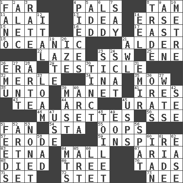 ACROSS 1. At a great distance 4. Friends 8. Scottish cap 11. Jai _ 13. The content of cognition 14. Celtic language 15. Remaining after all deductions 16. Whirlpool 17. 90 degrees 18. Pertaining to the sea 21. Tree or shrub in the Birch family 22. Goldbrick 23. Compass dir. 25. Compass dir. 26. Period 29. A testis 32. Haggard of country music 34. _ tizzy (2 wds.) 35. Cut the grass 38. To (old English) 39. French painter Edouard 41. Angers 43. Beverage made from leaves 44. Curve 45. A salt of uric acid 46. French bagpipes 50. Compass dir. 51. Air blower 54. R.R. building 55. I made a mistake 57. Wear away 59. Heighten or intensify 63. Inactive volcano in Sicily 64. Shopping center 67. Roberta Peters solo 68. Passed on 69. Woody plant 70. Small boys 71. Arrange properly for use 72. Proofreading order 73. Born DOWN 1. Papal veil 2. Actor Baldwin 3. Pace 4. Parts 5. Increase 6. Directed 7. Declare 8. Exchange 9. NE Netherlands city 10. Distance measurement (Brit.) 12. Slanted text style (abbr.) 14. Snakelike fish 19. Nathan's nickname 20. Ending with capital 21. Leather borer 23. Trig term 24. Leave at once 26. Australian flightless bird 27. Monthly bill 28. Johnson of "Laugh-In" 30. A color or tint 31. Arab leader 33. Rich soil 36. Mouths or openings 37. Soaks 39. Vertical spar for supporting sails 40. Length times width 42. Perceive with the eye 45. United States Postal Service (abbr.) 47. Purpose 48. Bathroom 49. Age 51. Gives food to 52. Nick name for Arthur 53. Music written for nine 56. Petty quarrel 58. June honoree 60. SW Asia republic 61. Travel on or in a vehicle 62. Comfort 64. Mountains (abbr.) 65. Nonscientific branch of learning 66. Area sheltered from the wind