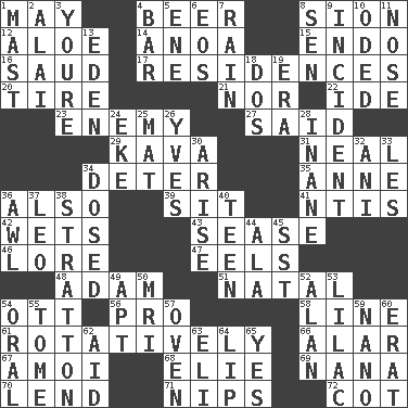 ACROSS 1. Fifth month 4. Fermented drink made from hops 8. The Jewish people; Israel 12. _ vera 14. Small Philippine buffalo 15. Inside; within (prefix) 16. Saudi Arabian king (1953-1964) 17. Homes 20. Hoop that covers a wheel 21. Or not 22. Binary compound 23. Foe 27. Alleged 29. Polynesian shrub of the pepper family 31. Be tempered by heat 34. Prevent from occurring 35. Queen of England 1702-14 36. In addition 39. Be seated 41. Nuclear Threat Initiatives 42. Soaks 43. Gospel singer Marvin 46. Old wives' tales, e.g. 47. Snakelike fish 48. First man 51. Brizilian seaport 54. Baseball player Mel 56. Adept person 58. Actor's bit 61. Producing rotation 66. Having or resembling wings 67. Mine, in Marseilles 68. Writer Wiesel 69. Grandmother 70. Grant temporary use of 71. Pinches, bites 72. Small bed DOWN 1. Vertical spar for supporting sails 2. Mountain range southwest of Kyrgyzstan 3. You are 4. Soap unit 5. Compass dir. 6. Greek goddess of the dawn 7. Water falling in drops from the sky 8. Elected rep. 9. Happening 10. Wrote a lyric poem 11. Sense of smell 13. Genesis locale 18. Two (Sp.) 19. Epoch 24. Make supply last 25. Floor protector 26. Jacques Cousteau's middle name 28. Silly 30. Ascend 32. Black tropical American cuckoo 33. French article 34. Administered medicine 36. Leather borer 37. Lion 38. Ski resort town in Vermont 40. Adolescent 44. According to 45. Fast jet (abbr.) 49. Fitting 50. Medical imaging device (abbr.) 52. ____ Jay Lerner 53. Pale purple color 54. Spoken 55. Heavy book 57. Baking chamber 59. Billionth: prefix 60. Part of Q.E.F. 62. Assist 63. Connecticut Ivy Leaguer 64. Mouth edge 65. Consenting reply