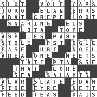 ACROSS 1. Narrow, elongated depression 5. Grand slam 9. Smile enhancers 13. "Corrida" creature 14. Style 15. Blunders 16. Blind as ____ 17. Streamer paper 18. Spoils 19. Catching in a trap 21. Raised railways 22. Globular water bottle used in Asia 23. Drink excessively 24. Cleo's killer 27. French article 28. Romantic infatuation 29. Fur scarf 31. Pacific Standard Time (abbr.) 32. Stare at amorously 36. Comfort 37. RI univ. 38. Christmas carol 39. Type of rug 40. Single 41. Confronts 42. Jacques of French films 44. Parent Teacher Assoc. 46. Compass dir. 47. Not this but _ 48. Old wives' tales, e.g. 50. Ocean 51. Deli grouping 54. Having or resembling wings 56. Chalkboard 58. Dutch treat 60. Travel on or in a vehicle 61. Jane of fiction 62. Remaining after all deductions 63. Nourish 64. Beverages made from leaves 65. Raised platform DOWN 1. R.R. building 2. Tennis shots 3. Northwest Algerian city 4. "_____ Recall" 5. Actresses Bloom and Felton 6. Cassini of fashion 7. Infant locale 8. Compass dir. 9. Portable communications device 10. Came up 11. Adept person 12. Fast jet (abbr.) 17. Quote 20. Hero or heavy, e.g. 21. Greek goddess of the dawn 23. Make lace 24. Toward the sea 25. Play the lead 26. Airs 28. 23rd letter of the Greek alphabet 30. Resembling or made to resemble leather 31. Before (prefix) 33. Moves 34. Allows 35. Otherwise 37. Single; one (prefix) 40. Baseball player Mel 41. Hindu Mythology: god of death 43. American Automobile Association (abbr.) 44. Food holders 45. Lacquered or enameled metalware 47. Sadhe (variant) 49. Make improvements or corrections to 51. "Two Mules for Sister ____" 52. It may be bright or harebrained 53. Suttee (variant) 54. Sandy's bark 55. Untruth 56. Arrange properly for use 57. Sodium hydroxide 59. Mountains (abbr.)