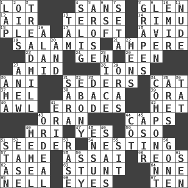 ACROSS 1. Car dealer's back yard 4. Without 8. Small, secluded valley 12. Wind 13. Laconic 14. Tall New Zealand timber tree 15. Entreaty 17. High up in or into the air 18. Enthusiastic 19. Deli grouping 21. Electrical Unit 23. Daniel's nick name 24. Commissioned mil. rank 26. Car or cant ending 27. Among 28. Charged particles 30. Black tropical American cuckoo 31. Spring feasts 34. Domesticated feline 37. Cartoonist voice _ Blanc 38. Phillipine bananalike plant 39. Mouth or opening 40. Leather borer 41. Eats (away) 42. Was introduced to 43. Northwest Algerian city 44. Balmoral and tarboosh 46. Medical imaging device (abbr.) 47. Consenting reply 50. Bear (Spanish) 51. Sowing specialist 54. Nestling 57. Docile 58. Slender Brazilian palm 60. Vintage cars 62. Toward the sea 63. Difficult or unusual or dangerous feat 64. Compass dir. 65. 1994 drama film starring Jodie Foster 66. Snake ____ (dice throw) 67. Nine, plus one DOWN 1. Infant locale 2. Lubricates 3. Excercise machine 4. Former Milwaukee Brewers owner Bud 5. Came up 6. Overdraft (abbr.) 7. Stalk of a moss capsule 8. Raisin fruits 9. Make or become more lively 10. Arab leader 11. Naked 13. Scottish cap 16. Mountain range southwest of Kyrgyzstan 20. Also 22. Not women's 25. Sibling's daughter 27. Afresh 29. Mouths or openings 30. Nanny (var.) 31. "Two Mules for Sister ____" 32. Black 33. June honoree 34. Piece 35. Ancient Greek god of war 36. Make lace 41. 4th largest of the Great Lakes 43. Severe or trying experience 44. Small bed 45. SW Saudi Arabia district 46. Klaipeda city 48. Follow as a consequence or result 49. Seines 51. Comedian Laurel of Laurel & Hardy 52. Relaxation 53. Raze (variant) 55. Be seated 56. Went 59. Filthy place 61. Elected rep.