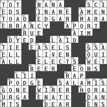 ACROSS 1. Small child 4. Grandmother 8. _-fi 11. Begley and Asner 12. Empty; void 14. So be it 15. Frog relative 17. _ Allan Poe 18. Hindu Mythology: god of death 19. The state or an instance of erring 21. To the left, to Queeg 23. Sorrow 24. Direct toward a target or goal 25. Colored 27. Put down 30. Standoff 31. Artist's stands 34. Girls' org. (abbr.) 37. Pipe bend 38. Make or become more lively 39. Fr. "Yes" 40. Everything 41. Chooses 43. Dripping 44. Fermented drink made from hops 45. Immeasurably long periods of time 47. Cards in a Roman deck? 49. Reproach for some lapse or misdeed 50. Porridge 52. Deli grouping 56. Went 57. One who wires 60. Israeli folk dance 61. Capital and largest city of Mongolia 62. Related on the mother's side 63. One of the 12 tribes of Israel 64. Mountains (abbr.) 65. Letter starter 66. Followers of ems DOWN 1. Wig 2. Scent 3. Russian ruler of old 4. Sibling's daughter 5. Actor Griffith 6. Tired old horse 7. Santa ___, CA 8. Excessive but superficial compliments 9. Certainty 10. _ tizzy (2 wds.) 13. Epoch 14. Mine, in Marseilles 16. Have the gumption 20. Naked 22. Writing tablet 25. Deli pickle 26. Shout 27. Crowbar 28. Actor Baldwin 29. Is not 30. Beverage made from leaves 32. Toward shelter 33. Filth; sediment 34. Bride's dress 35. Takes to court 36. Small island 42. Lick closed 44. Massive 46. Brightly colored fish 47. Yearns 48. It may be bright or harebrained 49. Less widely known 50. Sweet dark-red dessert wine 51. She-sheep 52. Stalk of a moss capsule 53. Method 54. SW Asia republic 55. Without 56. Chewing product 58. Working for oneself (abbr.) 59. Actress Charlotte