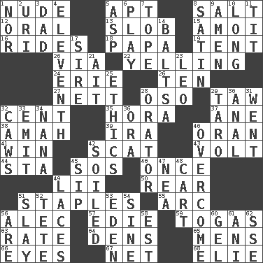 ACROSS 1. Naked 5. Fitting 8. Table seasoning 12. Spoken 13. Oscar Madison type 15. Mine, in Marseilles 16. Amusement-park features 18. Dad 19. Portable shelter 20. By way of 22. Crying or shouting loudly 24. 4th largest of the Great Lakes 26. Nine, plus one 27. Remaining after all deductions 28. Bear (Spanish) 29. The 23rd letter of the Hebrew alphabet 32. Penny 35. Israeli folk dance 37. A saturated hydrocarbon 38. Nursemaid 39. Lyricist Gershwin 40. Northwest Algerian city 41. Acquire through effort 42. Go away! 43. Electrical Unit 44. R.R. building 45. Mayday 46. Single time 49. Cards in a Roman deck? 50. Stern 51. Paper fasteners 55. Curve 56. Actor Baldwin 57. Singer Brickell 59. Ancient Roman robes 63. Pace 64. Habitations of wild animals 65. Not women's 66. Sight organs 67. Fish or hair follower 68. Writer Wiesel DOWN 1. And not 2. RI univ. 3. Male parent 4. Veterans Day date 5. Cleo's killer 6. Shaw product 7. Drink excessively 8. Smooth fabric 9. So be it 10. Protracted 11. Teat (slang) 14. Greek mezzo-soprano Agnes 17. Title for a man of rank and authority 21. Small island 23. Lion 25. Principles of right and wrong 28. Speaker 29. Edible starchy tuberous root 30. Of or related to the anus 31. Left 32. Crow sounds 33. Send forth 34. Nanny 36. Mouth or opening 40. Conquer 42. Dirtied 45. Small drink 47. Teachers' org. 48. Heavy open wagon 49. Shoestrings 51. Kill 52. False hair 53. Paradise 54. Trig term 56. "We ___ not amused" (Victoria) 58. Eastern Standard Time (abbr.) 60. Set 61. Black tropical American cuckoo 62. Compass dir.