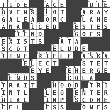 ACROSS 1. Event that recurs at intervals 5. Adept person 8. Shoshoni 11. Baking chambers 13. Car dealer's back yard 14. Like ___ of sunshine 15. An organ shaped like a helmet 16. The grampus (Milton) 17. Unable to walk 18. Santa ___, CA 19. On the rocks 21. _____ Park, CO 22. Be inclined (to) 24. Travels 25. Is 27. _ moment's notice (2 wds.) 29. Highlander 30. Evade 32. Prong on a fork 33. Firearm 35. "____ silly question..." 39. Choose 41. Proofreading order 42. Sight organ 43. Develop 45. Conclusions 48. Root beer relative 49. Distinguishing feature 50. Parka part 52. Three (prefix) 55. International (abbr.) 56. Lion 57. Keyboard key 59. Monetary unit of Yemen 60. Naughty child 61. Biscuitlike quick bread 62. Snakelike fish 63. Double-curved letter 64. Singles DOWN 1. Ancient Roman robe 2. "Terrible" tsar 3. Conveyance 4. Compass dir. 5. _ vera 6. Drawstring 7. And so on (abbr.) 8. A salt of uric acid 9. Corrects by punishment or discipline 10. Sight organs 12. Virtuous person 14. In addition 20. Music discs 21. Mild oath 23. First name in cosmetics 25. Eastern Standard Time (abbr.) 26. One more than ninety 27. 100% 28. Third day of the wk. 30. Newt 31. Artist's stand 33. Marina Del _, California 34. Frozen water 36. Ski resort town in Vermont 37. Barrel 38. Had dinner 40. For fear that 43. Environmental prefix 44. Methods 45. Bert's buddy 46. Relating to or accompanying birth 47. Deli pickle 49. Become fatigued 50. Is hesitant and indecisive 51. I made a mistake 53. French philosopher Descartes 54. Angers 56. Untruth 58. Non-commissioned officer (abbr.)