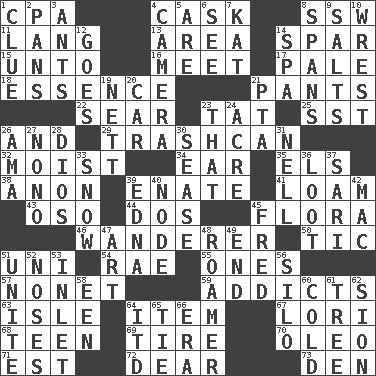 ACROSS 1. Accounting whiz (abbr.) 4. Keg 8. Compass dir. 11. Austrian-born American filmmaker Fritz 13. Type of rug 14. Coast Guard woman 15. To (old English) 16. Rendezvous 17. Diluted with white 18. Core 21. Leg coverings 22. Wither 23. Make lace 25. Fast jet (abbr.) 26. Added to 29. File 13 32. Wet 34. Hearing organ 35. Raised railways 38. At once, immediately (arch.) 39. Related on the mother's side 41. Rich soil 43. Bear (Spanish) 44. Two (Sp.) 45. Plants 46. Roamer 50. Nervous spasm 51. Single; one (prefix) 54. Actress Charlotte 55. Washington bills 57. Music written for nine 59. Inveterate users 63. Small island 64. A whole individual unit 67. Australian parrot (variant) 68. Adolescent 69. Become fatigued 70. Butter sub 71. Eastern Standard Time (abbr.) 72. Letter starter 73. Lair DOWN 1. A slight indication 2. Zero-star reviews 3. Pismires 4. Device for capturing images 5. "We ___ not amused" (Victoria) 6. Observe 7. Krazy ___ of comics 8. Connects, as a bridge 9. Table seasonings 10. Obtain by seizing forcibly or violently 12. Leaves 14. Health resort 19. Remaining after all deductions 20. Auto 21. Parent Teacher Assoc. 23. Not this but _ 24. Measure of real estate 26. Housemaid (var.) 27. Words to Nanette 28. "Vaya con ____" 30. Gospel singer Marvin 31. 1994 drama film starring Jodie Foster 33. Frozen precipitation 36. Spoils 37. Indian skirt 39. Pulitzer Prize-winning author Ferber 40. Thickened enlargement 42. Big _ 45. Flintstone 47. Tate display 48. Nomad 49. Conclude 51. Join together 52. Olfactory organs 53. An arm off of a larger body of water 56. Grain storage tower 58. Car or cant ending 60. Lacking warmth 61. Relationship diagram 62. The Jewish people; Israel 64. It would 65. Make a knot 66. Period
