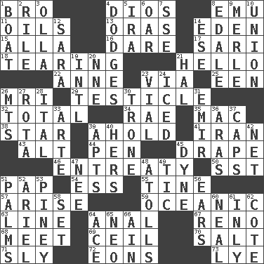 ACROSS 1. Sis' sibling 4. "Vaya con ____" 8. Australian flightless bird 11. Lubricates 13. Mouths or openings 14. Locale of original sin 15. Silent film actress Nazimova 16. Have the gumption 17. Indian skirt 18. Rending 21. Phone greeting 22. Singer Murray 23. By way of 25. Car or cant ending 26. Medical imaging device (abbr.) 29. One of the two male reproductive glands 32. Add up to 34. Actress Charlotte 35. Big _ 38. Play the lead 39. Hold, grip (Informal) 41. SW Asia republic 43. Keyboard modifier key 44. Animal enclosure 45. Window treatment 46. Plea 50. Fast jet (abbr.) 51. Infant food 54. Double-curved letter 55. Prong on a fork 57. Ascend 59. Pertaining to the sea 63. Actor's bit 64. Of or related to the anus 67. Western Nevada city 68. Confront 69. To provide with a ceiling 70. Table seasoning 71. Insidious 72. Immeasurably long periods of time 73. Sodium hydroxide DOWN 1. Water vessel 2. Cause heat under the collar 3. Rounded earthenware pot or jar 4. Evades 5. Retirement account (abbr.) 6. Rowing implement 7. Compass dir. 8. Peak District village in England 9. Haggard of country music 10. The state of being joined or united 12. "Two Mules for Sister ____" 14. Compass dir. 19. International (abbr.) 20. Compass dir. 21. Actor Linden 23. Small bottle 24. On the rocks 26. Mountains (abbr.) 27. Roll call or roster of names 28. Slanted text style (abbr.) 30. Marketplace scale 31. Arab leader 33. Johnson of "Laugh-In" 36. Caspian sea tributary 37. Smile enhancers 39. Tenement units (abbr.) 40. Possessive pronoun 42. Fish or hair follower 45. Unit of force 47. Born 48. Ringlike coral islands and reefs 49. Nervous spasm 51. Insides of hands 52. Satellite of Uranus 53. Abounding in pines 56. Hearing organs 58. Put into a specified state 60. Anneal 61. In an inward manner 62. ____ d'Azur (French Riviera) 64. Adept person 65. Modern: prefix 66. The 18th letter of the Arabic alphabet