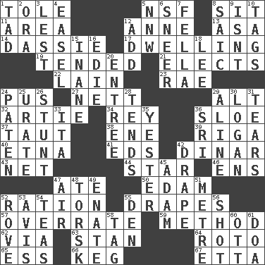 ACROSS 1. Lacquered or enameled metalware 5. Overdraft (abbr.) 8. Be seated 11. Length times width 12. Singer Murray 13. White ___ sheet 14. Hyrax 17. Home 19. Looked after 21. Chooses 22. (Had) reclined 23. Actress Charlotte 24. Purulenc 27. Remaining after all deductions 29. The first octave above the treble staff 32. Nick name for Arthur 34. Marina Del _, California 36. _ gin 37. Pulled tight 38. Compass dir. 39. Capital of Latvia 40. Inactive volcano in Sicily 41. Begley and Asner 42. Middle Eastern gold or silver currency 43. Fish or hair follower 44. Play the lead 46. Followers of ems 47. Had dinner 50. Dutch treat 52. Food allowance for one day 55. Window treatments 57. Make much ado about nothing 59. Mode 62. By way of 63. Comedian Laurel of Laurel & Hardy 64. Printing process, for short 65. Curvy letter 66. Cask 67. Singer James DOWN 1. Bit 2. Mouth or opening 3. For fear that 4. Artist's stand 5. Compass dir. 6. Scornful expression 7. Man or boy (slang) 8. Ketch in the Levant 9. Is not 10. Labels 12. Say or write further 15. Silly 16. Singer Brickell 18. Area sheltered from the wind 20. Main course 24. Eucharist need 25. A salt of uric acid 26. Difficult or unusual or dangerous feat 28. Looks after 29. Place in a line 30. Utah city north of Ogden 31. Lacerates 33. Call ___ day 35. Last 36. Indian title of respect (Mr.) 42. Window treatment 45. First of billions? 47. Wind 48. Cod relative 49. Related on the mother's side 51. Distance measurement (Brit.) 52. Be footloose 53. Opinion 54. Afternoon social gatherings 55. Lair 56. Opportunity 58. Label 60. Baseball player Mel 61. ___ good deed