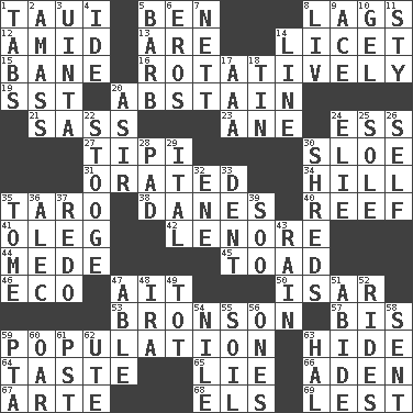 ACROSS 1. "Change" in Tahitian 5. Benjamin's nick name 8. Fails to keep up a pace 12. Among 13. "We ___ not amused" (Victoria) 14. It is permitted: Lat. 15. Object of repulsion 16. Rotating or pertaining to rotation 19. Fast jet (abbr.) 20. Refrain by choice 21. Backtalk 23. One (Scot) 24. Double-curved letter 27. Native american tent (variation) 30. _ gin 31. Spoke pompously 34. Land elevation 35. Edible starchy tuberous root 38. Natives or inhabitants of Denmark 40. Coral collection 41. Cassini of fashion 42. Poe poem 44. Ancient Persian 45. Frog relative 46. Environmental prefix 47. Small island 50. Austrian river, tributary to the Danube 53. "Death Wish" actor 57. Again 59. Census information 63. Flintstone garb 64. Clothes sense 65. Whopper 66. Arabian gulf 67. Johnson of "Laugh-In" 68. Raised railways 69. For fear that DOWN 1. Bar bills 2. Collect or gather 3. National forest in Provo, Utah 4. Binary compound 5. Sharp remark 6. Greek god of love 7. Remaining after all deductions 8. 54 in ancient Rome 9. Adept person 10. Set 11. Filthy place 14. Actor's bit 17. Auto club (abbr.) 18. Metal container 20. SW Saudi Arabia district 22. Moe Howard, for one 24. Writer Wiesel 25. Flatfish 26. Automatically 28. Groovy apt. 29. Slanted text style (abbr.) 30. Fragments 32. Compass dir. 33. Incision 35. Heavy book 36. Actor Baldwin 37. Do over again 39. "Barney Miller" actor Jack 43. Precipitation 47. Competent 48. Lyricist Gershwin 49. Small child 51. Stay 52. Amusement-park features 54. Mediterranean tributary 55. Earth 56. Singles 58. Emitted 59. Parent Teacher Assoc. 60. Rowing implement 61. Pacific Standard Time (abbr.) 62. Shoshoni 63. Actor Linden