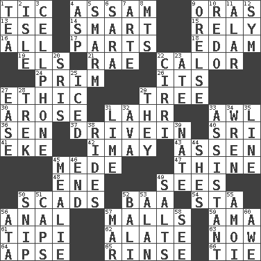 ACROSS 1. Nervous spasm 4. Indian state 9. Mouths or openings 13. Compass dir. 14. Don Adams' spy role 15. Trust 16. 100% 17. Components 18. Dutch treat 19. Raised railways 21. Actress Charlotte 22. Bodily heat indicating an inflammation 24. Demure 26. It is 27. Principle of right and wrong 29. Relationship diagram 30. Came up 31. Cowardly lion portrayer 33. Leather borer 36. Elected rep. 37. Popular '50s hangout 40. Indian title of respect (Mr.) 41. Supplement with great effort 42. "If ____ say so..." 43. NE Netherlands city 45. Ancient Persian 47. One or ones belonging to thee 48. Compass dir. 49. Perceives with the eye 50. Oodles 52. Sound made by sheep 54. R.R. building 56. Of or related to the anus 57. Shopping centers 59. Wet nurse (var.) 61. Native american tent (variation) 62. Having winglike extensions 63. Immediately 64. Domed church section 65. Remove soap 66. Neckwear DOWN 1. Afternoon social gathering 2. Capri or Wright 3. Portable communications device 4. Viper 5. Excessive but superficial compliments 6. "Two Mules for Sister ____" 7. Johnson of "Laugh-In" 8. Mountains (abbr.) 9. Threatening words 10. Redecorate 11. Having or resembling wings 12. Symbol (abbr.) 20. Indian titles of respect 22. High-altitude cloud 23. Had dinner 25. On the rocks 27. Comfort 28. Long journey 29. Those things 31. Welles in "The Third Man" 32. Actress Gardner 33. Helper 34. Songbird 35. Actor's bit 38. Amusement-park features 39. Nathan's nickname 44. "______ My Girl" (Turtles hit) 45. Ear of corn 46. Conclude 49. Table seasonings 50. Sever or remove by pinching or nipping 51. Smile enhancers 52. Indonesian resort city 53. Actor Alda or Thicke 55. Mine, in Marseilles 56. _ moment's notice (2 wds.) 57. Impair 58. Observe 60. Deep reverence