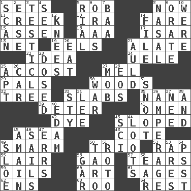 ACROSS 1. Arranges properly for use 5. Director Reiner 8. At this time 11. Small stream 13. Retirement account (abbr.) 14. Conductor's collection 15. NE Netherlands city 16. American Automobile Association (abbr.) 17. Austrian river, tributary to the Danube 18. Fish or hair follower 19. Snakelike fish 21. Having winglike extensions 22. The main thing one is thinking about 24. Ubangi River tributary 25. Buttonhole 27. Cartoonist voice _ Blanc 29. Friends 30. Forest 32. Family _ (genealogy) 33. Thick slices 35. Grandmother 39. Prevent from occurring 41. Presage 42. Color 43. Slanted 45. Toward the sea 48. ____ d'Azur (French Riviera) 49. Excessive but superficial compliments 50. Musical group of three 52. Hit sharply and swiftly 55. Den 56. E Mali city 57. Separates forcefully 59. Petroleums 60. Nonscientific branch of learning 61. Gurus 62. Followers of ems 63. Friend of Pooh 64. Relief DOWN 1. Examine hastily 2. Celtic language 3. One of the two male reproductive glands 4. Observe 5. Monetary unit of Yemen 6. Mouths or openings 7. Sound made by sheep 8. Rhinal 9. Declaim 10. Past tense of be (plural) 12. Leg joints 14. Do some clerical work 20. Ingest 21. Old (Scot.) 23. Administered medicine 25. Fitting 26. 4-wheeled motor vehicle 27. Disorderly crowd 28. Greek goddess of the dawn 30. Armed conflict 31. Snout, nose 33. Filthy place 34. Area sheltered from the wind 36. Electrical Measurement 37. Born 38. Also 40. Dutch treat 43. _-fi 44. Plunders 45. At full speed 46. Moves on water 47. Blunders 49. A type of plum 50. Pacific island yam 51. Printing process, for short 53. Ancient Greek god of war 54. Inconspicuous attention getter 56. Slender fish 58. Hearing organ