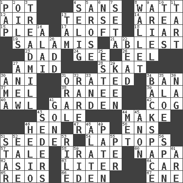 ACROSS 1. Cooking vessel 4. Without 8. Electrical Unit 12. Atmosphere 13. Laconic 14. Type of rug 15. Entreaty 17. High up in or into the air 18. One who doesn't tell the truth 19. Deli grouping 21. Most capable 23. June honoree 24. Turn to the right 26. Snakelike fish 27. Among 28. Three-handed card game 30. Cuckoo 31. Declaimed 34. Forbid 37. Cartoonist voice _ Blanc 38. Indian princess (variant) 39. Chicken ___ king 40. Leather borer 41. Place where plants grow 42. Gear tooth 43. Not divided or shared with others 44. Create 46. Layer 47. Reproach for some lapse or misdeed 50. Followers of ems 51. Sowing specialist 54. Portable computers 57. Falsehood 58. Feeling or showing extreme anger 60. California wine valley 62. SW Saudi Arabia district 63. 61 cubic inches 64. Automobile 65. Vintage cars 66. Genesis locale 67. Compass dir. DOWN 1. Infant food 2. Petroleums 3. Excercise machine 4. Former Milwaukee Brewers owner Bud 5. Came up 6. Science/research agcy. 7. Bristle 8. Place for singles 9. Satellite of Uranus 10. Beverages made from leaves 11. Small pie 13. Scottish cap 16. Mountain range southwest of Kyrgyzstan 20. Say or write further 22. Necklace unit 25. First name in cosmetics 27. Afresh 29. Peachy ____! 30. Nursemaid (var.) 31. Spoken 32. More valued for its uncommonness 33. Added to 34. Keyboard key 35. _ vera 36. Tired old horse 41. Went 43. Spring feasts 44. Was introduced to 45. At once, immediately (arch.) 46. Sun: prefix 48. Having winglike extensions 49. Eucharist need 51. Play the lead 52. Comfort 53. Cause heat under the collar 55. For each 56. Connect, as a bridge 59. To free from 61. "We ___ not amused" (Victoria)