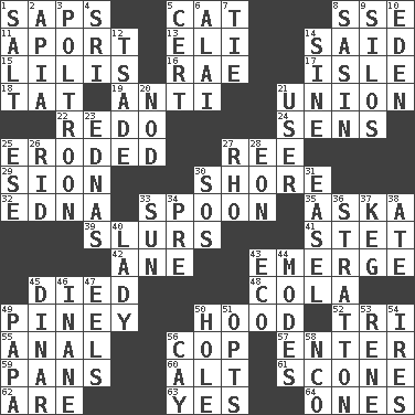ACROSS 1. Plant excrements 5. Domesticated feline 8. Compass dir. 11. To the left, to Queeg 13. Connecticut Ivy Leaguer 14. Stated 15. Ms. Damita and namesakes 16. Actress Charlotte 17. Capri or Wright 18. Make lace 19. Opposed to 21. The state of being joined or united 22. Make new 24. Elected reps. 25. Eaten away 27. To sift 29. The Jewish people; Israel 30. Dinah or Pauly 32. Pulitzer Prize-winning author Ferber 33. Soup utensil 35. "____ silly question..." 39. Runs notes together 41. Proofreading order 42. A saturated hydrocarbon 43. Develop 45. Passed on 48. Root beer relative 49. Abounding in pines 50. Parka part 52. Three (prefix) 55. Of or related to the anus 56. Police officer (slang) 57. Keyboard key 59. Zero-star reviews 60. The first octave above the treble staff 61. Biscuitlike quick bread 62. "We ___ not amused" (Victoria) 63. Consenting reply 64. Washington bills DOWN 1. Table seasoning 2. Capital of Western Samoa 3. Characterized by complete cowardliness 4. _ Lanka 5. Foregone conclusion 6. Mountain range southwest of Kyrgyzstan 7. Neckwear 8. Indian antelope 9. Grain storage towers 10. Paradise 12. Sadhe (variant) 14. Trig term 20. Dreamland 21. One who uses or employs something 23. Ferber et al. 25. Compass dir. 26. To free from 27. 17th letter of the Greek alphabet 28. Age 30. Distress signal 31. Artist's stand 33. Player for Phoenix 34. Before (prefix) 36. Ski resort town in Vermont 37. Cask 38. Had dinner 40. Kenny Rogers chart-topper in '80 43. Environmental prefix 44. Methods 45. Middle Eastern gold or silver currency 46. Empty; void 47. Snakelike fish 49. Dad 50. Hollow 51. Chooses 53. French philosopher Descartes 54. Angers 56. Island 58. Non-commissioned officer (abbr.)