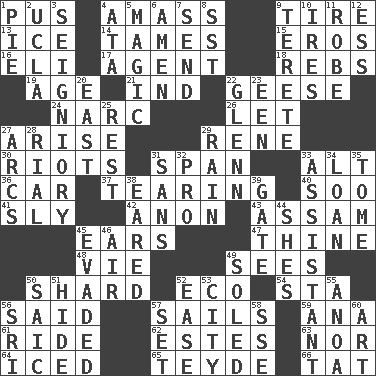 ACROSS 1. Fluid product of inflammation 4. Collect or gather 9. Become fatigued 13. Frozen water 14. Domesticates 15. Greek god of love 16. Biblical high priest 17. Rep 18. Confederate soldiers (slang) 19. Mature 21. Working for oneself (abbr.) 22. Honkers 24. Drug cop 26. Allow 27. Get up 29. French philosopher Descartes 30. Debaucheries 31. Connect, as a bridge 33. Keyboard modifier key 36. 4-wheeled motor vehicle 37. Pulling apart 40. "Barney Miller" actor Jack 41. Playfully artful 42. Soon (poet.) 43. Indian state 45. Hearing organs 47. One or ones belonging to thee 48. Compete 49. Perceives with the eye 50. Broken piece 52. Environmental prefix 54. R.R. building 56. Alleged 57. Travel by water 59. Santa ___, CA 61. Travel on an animal 62. _____ Park, CO 63. Or not 64. On the rocks 65. Miss Universe 1986, Barbara Palacios _ 66. Make lace DOWN 1. Sliced dessert 2. Southern CA. univ. 3. Signiory (variant) 4. _ moment's notice (2 wds.) 5. Mysterious quality of enchantment 6. So be it 7. Transmit 8. Fast jet (abbr.) 9. Cigar-shaped 10. Angers 11. Loose flowing garment 12. Curvy letter 20. Compass direction 22. American astronaut and politician John 23. Car or cant ending 25. Take ten 27. Arches 28. Monetary unit of Yemen 29. Water falling in drops from the sky 31. Without 32. Adept person 33. Helper 34. Grant temporary use of 35. Heavy book 38. Having ears or earlike features 39. Yard entry 44. "______ My Girl" (Turtles hit) 45. Dodged 46. Wind 49. Having a sole or soles 50. Ketch in the Levant 51. Flintstone garb 52. Relaxation 53. Municipality 55. Small Philippine buffalo 56. _ Lanka 57. Arrange properly for use 58. Compass dir. 60. Tate display