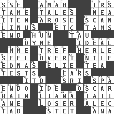 ACROSS 1. Compass dir. 4. Nanny 8. Big collection agency 11. Not wild 13. Stories 15. Teachers' org. 16. Detail 17. Came up 18. Glance over 19. "_ and Lucy" (Charlie Brown theme song) 21. And so on (abbr.) 22. Scottish caps 23. Conclude 24. Attila the _ 27. The 19th letter of the Greek alphabet 29. Centimeter-gram-second unit of force 30. Standard of perfection 34. Madame (abbr.) 36. Unclean, religiously 39. Haggard of country music 40. Stitch closed the eyes of (a falcon) 41. Unconcealed 43. The longest river in the world 44. Ferber et al. 46. Writer Wiesel 47. Beverage made from leaves 48. Trials 49. Hearing organs 51. It would 53. _ Lanka 54. Health resort 57. Inside; within (prefix) 60. Binary compound 63. Witty Wilde 65. Precipitation 66. Woody, climbing, usually tropical plant 69. Jacques of French films 70. A saturated hydrocarbon 71. Failure 72. Actor Baldwin 73. Small boy 74. Proofreading order 75. Santa ___, CA DOWN 1. Vertical member of a panel or frame 2. Smooth fabric 3. Make improvements or corrections to 4. _ moment's notice (2 wds.) 5. Impair 6. Medicinal plant 7. Behest 8. South American Indian 9. 480, 500 or 516 sheets of paper 10. Without 12. Australian flightless bird 14. Religious group 18. SAT takers 20. Like a shrinking violet 25. To (old English) 26. Boldness 28. Direct toward a target or goal 29. Accusation by an informer 31. 4th largest of the Great Lakes 32. Silent film actress Nazimova 33. Area sheltered from the wind 34. Ancient Persian 35. Not women's 37. Snakelike fish 38. Strips of potato fried in deep fat 40. Arrange properly for use 42. Rend 45. Fast jet (abbr.) 50. _ de Janeiro 52. Deli pickle 54. Any of the three canals of the cochlea 55. Eucharist need 56. N. Chile seaport 57. Part of Q.E.F. 58. Grandmother 59. Passed on 61. "Vaya con ____" 62. Compass direction 64. R.R. building 67. Born 68. Tate display