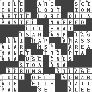 ACROSS 1. Hollow 5. Curve 8. _-fi 11. Supplemented with great effort 12. Plunder 14. Electrically charged atom 15. Nick name for Arthur 17. Old wives' tales, e.g. 18. Spanish pot 19. Soft color 21. Slept 23. Cards in a Roman deck? 25. Part of Q.E.F. 26. Russian ruler of old 27. Cleo's killer 28. Label 31. Corn or form start 33. Strike 35. Collect or gather 37. Having or resembling wings 38. Science/research agcy. 40. Type of rug 41. French painter Edouard 43. Three (prefix) 45. Parent Teacher Assoc. 46. Santa ___, CA 47. Purpose 50. Extremities 52. Portico 53. Heredity factor (abbr.) 54. Summer TV shows 56. Fodder prepared in a silo 61. Farming town in central California 62. Small valley 65. Underwater navigation system 66. Had dinner 67. Writer Wiesel 68. Jacques of French films 69. Baking dish 70. Put into a specified state 71. Toward shelter DOWN 1. Pile 2. Gumbo ingredient 3. Allows 4. Prepare for publication 5. Everything 6. Friend of Pooh 7. Pupil covering 8. Filth; sediment 9. Having a low temperature 10. _ tizzy (2 wds.) 13. Lacerates 16. Snakelike fish 18. Choose 20. One who doesn't tell the truth 22. Dad 24. SW Asia republic 26. Hoop that covers a wheel 28. Small pie 29. Toward the sea 30. Girls' org. (abbr.) 31. ____ Bator 32. Nanny 34. Pacific Standard Time (abbr.) 36. Atlas contents 37. Wet nurse (var.) 39. Flintstone 42. Ballerina skirt 44. Lodging establishments 48. Message 49. Artist's stands 51. Raised platform 52. Indian title of respect (Mr.) 54. Round or rotation of duties 55. Genesis locale 57. Globular water bottle used in Asia 58. Of or related to the anus 59. Yard entry 60. 4th largest of the Great Lakes 61. Infant locale 63. Untruth 64. Allow