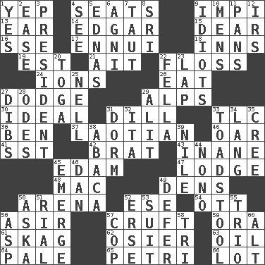 ACROSS 1. Slangy assent 4. Theater features 9. Body of Kaffir warriors 13. Hearing organ 14. _ Allan Poe 15. Letter starter 16. Compass dir. 17. World-weariness 18. Lodging establishments 19. Eastern Standard Time (abbr.) 21. Small island 22. Soft thread for cleaning between teeth 24. Charged atoms 26. Consume 27. Evade 29. High mountains 30. Standard of perfection 31. Deli pickle 33. Affectionate concern, for short 36. Benjamin's nick name 37. Of or relating to Laos or its people 40. Rowing implement 41. Fast jet (abbr.) 42. Naughty child 43. Empty; void 45. Dutch treat 47. Cabin 48. Apple computer (short form) 49. Hiding places for outlaws 50. Sports stadium 52. Compass dir. 54. Baseball player Mel 56. SW Saudi Arabia district 57. An unpleasant substance 59. Mouth or opening 61. Heroin 62. Flexible twig of a willow tree 63. Petroleum 64. Light colored 65. _ dish (used to culture cells) 66. Car dealer's back yard DOWN 1. Consenting reply 2. Relaxation 3. Elected leader of a country 4. Observe 5. Ferber et al. 6. Hindu god of fire 7. Pulled tight 8. _ Lanka 9. Foolish or stupid persons 10. Not women's 11. Zero-star reviews 12. Big collection agency 20. Ancient Roman robe 22. Man or boy (slang) 23. Infant locale 25. 1994 drama film starring Jodie Foster 27. Rights 28. Lyric poems 29. Came down and settled, as after flight 31. Dormintory (informal) 32. Call ___ day 33. Inedible or poisonous agaric 34. Long (Scottish) 35. Algonquian 38. Phillipine bananalike plant 39. The longest river in the world 44. Words to Nanette 45. Develop 46. One of the 12 tribes of Israel 49. Postpone 50. "____ silly question..." 51. Monetary unit of Yemen 52. Celtic language 53. Set or collection 55. Musical group of three 56. Viper 57. Police officer (slang) 58. Three (prefix) 60. The first octave above the treble staff