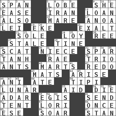 ACROSS 1. Connect, as a bridge 5. Ear part 9. A female animal or person 12. Relaxation 13. SW Asia republic 14. Grant temporary use of 15. In addition 16. Female horse 17. Small Philippine buffalo 18. Luau accessory 19. Supplement with great effort 21. Glorify 22. Flatfish 24. Myrna of the movies 26. Portuguese money of account (variant) 27. Lacking originality or spontaneity 28. Prong on a fork 29. Scram, to a cat 30. Sibling's daughter 32. Practice fight 36. Hyperbolic tangent 37. Actress Charlotte 38. Musical group of three 39. Pismires 40. Shops 42. Do over again 43. Floor coverings 44. Originate 46. Black tropical American cuckoo 49. Had dinner 50. Native american tent (variation) 51. Type of eclipse 53. Help 54. Expire 57. The sixth month of the Jewish calendar 58. Armor plate that protects the chest 61. Post 62. Portable shelter 63. Australian parrot (variant) 64. Single time 65. Compass dir. 66. Fly high 67. Comedian Laurel of Laurel & Hardy DOWN 1. Lick closed 2. Diluted with white 3. Aide 4. Modern: prefix 5. Welles in "The Third Man" 6. Mouth or opening 7. Soap unit 8. Compass dir. 9. Underwater navigation system 10. White Person, in Hawaii 11. Related on the mother's side 14. Not strict 19. Pipe bend 20. Peachy ____! 21. Sight organ 23. Expletives 24. It is permitted: Lat. 25. Single 27. Skim 28. Pulls into pieces 29. R.R. building 31. Feeling or showing extreme anger 32. Long narrow piece of something 33. Elected leader of a country 34. Helper 35. Friend of Pooh 40. Floor covering 41. Suttee (variant) 43. Make imperfect 45. To free from 46. Having winglike extensions 47. Unadorned figures 48. Lacking in sense or substance 52. Nonscientific branch of learning 53. SW Saudi Arabia district 55. South American Indian 56. Paradise 58. Raised railways 59. Thick or sticky substance 60. Lyricist Gershwin 61. Mayday