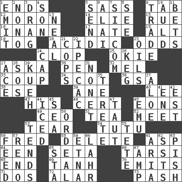 ACROSS 1. Extremities 5. Backtalk 9. Bar bill 12. Person of subnormal intelligence 14. Writer Wiesel 15. Sorrow 16. Silly 17. Nathan's nickname 18. The first octave above the treble staff 19. Coat; cloak 20. Being or containing an acid 23. Likelihood 24. Hoof sound 25. Migrant worker of the '30s 27. "____ silly question..." 30. Animal enclosure 32. Cartoonist voice _ Blanc 33. Clever action or accomplishment 34. Highlander 36. Girls' org. (abbr.) 38. Compass dir. 39. A saturated hydrocarbon 40. Area sheltered from the wind 43. Part of HMS, perhaps 46. Sure thing 48. Immeasurably long periods of time 49. Corporate head (abbr.) 51. Beverage made from leaves 52. Rendezvous 53. Pull apart 54. Ballerina skirt 56. Flintstone 58. Erase 61. Cleo's killer 64. Car or cant ending 65. Bristle 66. Tarsus (plural) 68. Conclusion 69. Hyperbolic tangent 70. Gives off 71. Two (Sp.) 72. Having or resembling wings 73. Romantic infatuation DOWN 1. Send forth 2. Words to Nanette 3. To be drawn or hauled along 4. Male child 5. Transmit 6. Mountain range southwest of Kyrgyzstan 7. "Cheers" or "Ellen" 8. Observe 9. Exchange 10. Old (Scot.) 11. Wagers 13. Anneal 21. 911 reaches them 22. Medicinal drug used to evoke vomiting 23. Lubricates 24. Head covering 26. Barrel 27. Adept person 28. Distress signal 29. Malaysian steamed pastry 31. Music written for nine 35. Cylindrical with tapered ends 37. Medicinal plant 41. Compass dir. 42. Eastern Standard Time (abbr.) 44. On the rocks 45. Ocean 47. Tense 48. Australian flightless bird 50. Severe or trying experience 53. Looks after 55. False hair 56. Nourish 57. Former U.S. Attorney General Janet 59. Inactive volcano in Sicily 60. Cowardly lion portrayer 61. Operatic vocal solo 62. Fast planes 63. Expression of disdain 65. R.R. building 67. Electrical Unit