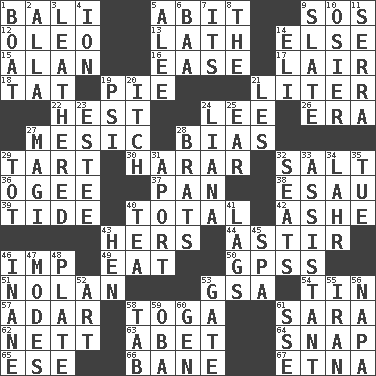 ACROSS 1. Indonesian resort city 5. "This won't hurt ____!" 9. Distress signal 12. Butter sub 13. Thin strip of wood or metal 14. Otherwise 15. Actor Alda or Thicke 16. Comfort 17. Den 18. Make lace 19. Sliced dessert 21. 61 cubic inches 22. Behest 24. Area sheltered from the wind 26. Epoch 27. Mesonic 28. Prejudice 29. Small pie 30. Ethiopian city, capital of Harari 32. Table seasoning 36. Double curve, resembling the letter S 37. Baking dish 38. Son of Isaac 39. Periodic rise and fall of the sea level 40. "_____ Recall" 42. American tennis player Robert 43. Possessive pronoun 44. Moving or stirring 46. Naughty child 49. Ingest 50. Global Positioning Systems (abbr.) 51. Pitcher Ryan 53. Girls' org. (abbr.) 54. Metal container 57. The sixth month of the Jewish calendar 58. Ancient Roman robe 61. "Two Mules for Sister ____" 62. Remaining after all deductions 63. Collude with 64. Fastener 65. Compass dir. 66. Object of repulsion 67. Inactive volcano in Sicily DOWN 1. Water vessel 2. Silent film actress Nazimova 3. Tough but pliablecoriaceous 4. Electrically charged atom 5. Toward shelter 6. Sound made by sheep 7. It is 8. Definite Article 9. Schedule 10. Flexible twig of a willow tree 11. Father Junipero _ 14. Connecticut Ivy Leaguer 19. Air pressure measure (abbr.) 20. Hankering 21. French article 23. First name in cosmetics 24. Woody, climbing, usually tropical plant 25. Ewer handle 27. Wise men 28. Naughty children 29. Small child 31. To the left, to Queeg 32. Theater features 33. Helper 34. Cowardly lion portrayer 35. Third day of the wk. 40. Afternoon social gathering 41. Falls behind 43. Layer 45. Health resort 46. Lacking in sense or substance 47. Methods 48. Food holder 52. Tate display 53. Yard entry 55. SW Asia republic 56. California wine valley 58. Keyboard key 59. Chief or king in Benin or Nigeria 60. Commissioned mil. rank 61. Compass dir.