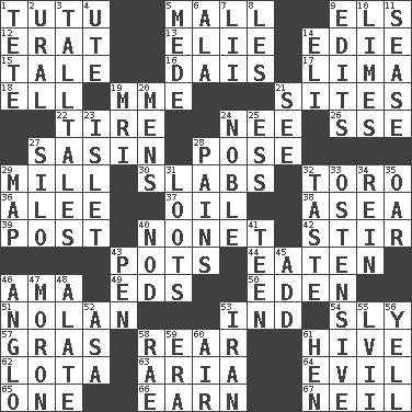 ACROSS 1. Ballerina skirt 5. Shopping center 9. Raised railways 12. Part of Q.E.F. 13. Writer Wiesel 14. Singer Brickell 15. Story 16. Raised platform 17. Pale green bean 18. Pipe bend 19. Madame (abbr.) 21. Locates 22. Become fatigued 24. Born 26. Compass dir. 27. Indian antelope 28. Introduce or present, as a question 29. Place where flour is made 30. Broad, flat, thick pieces 32. "Corrida" creature 36. Toward shelter 37. Petroleum 38. Toward the sea 39. Mail 40. Music written for nine 42. Commotion 43. Cooking vessels 44. Consumed 46. Nanny (var.) 49. Begley and Asner 50. Genesis locale 51. Pitcher Ryan 53. Working for oneself (abbr.) 54. Roguish 57. Pate de foie ____ 58. Stern 61. Hub of activity 62. Globular water bottle used in Asia 63. Roberta Peters solo 64. Morally bad or wrong 65. Single 66. Merit 67. Famous astronaut Armstrong DOWN 1. Wig 2. Mountain range 3. Baron Munchausen's specialties 4. Shoshoni 5. Ancient Persian 6. Wing 7. Cards in a Roman deck? 8. French article 9. Prepares for publication 10. Citrus fruits 11. Gospel singer Marvin 14. Connecticut Ivy Leaguer 19. Medical imaging device (abbr.) 20. Not women's 21. Perceive with the eye 23. Small island 24. Having high moral qualities 25. Double-curved letter 27. Grain storage tower 28. Aches 29. Atlas unit 31. Plunders 32. Clothes sense 33. Clearly or manifestly demonstrative 34. It's straight from the horse's mouth 35. Boat paddle 40. Lower and raise head in agreement 41. Adolescent 43. Fenced enclosure 45. Increase 46. White American of non-Hispanic descent 47. Person of subnormal intelligence 48. Having winglike extensions 52. White ___ sheet 53. SW Asia republic 55. 57 in ancient Rome 56. Shout 58. Actress Charlotte 59. Period 60. Wind 61. Layer