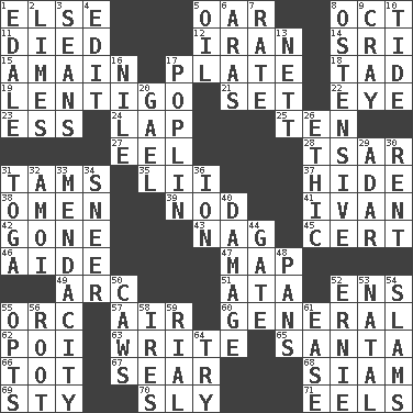 ACROSS 1. Otherwise 5. Rowing implement 8. Sep. follower 11. Passed on 12. SW Asia republic 14. _ Lanka 15. With great haste 17. Food holder 18. Bit 19. Small, flat, pigmented spot on the skin 21. Arrange properly for use 22. Sight organ 23. Double-curved letter 24. Pet locale 25. "___ Little Indians" 27. Snakelike fish 28. Russian ruler of old 31. Scottish caps 35. Cards in a Roman deck? 37. Flintstone garb 38. Sign of things to come 39. Dreamland 41. "Terrible" tsar 42. Went 43. Tired old horse 45. An absolute certainty 46. Assistant 47. Atlas unit 49. Curve 51. _ moment's notice (2 wds.) 52. Followers of ems 55. The grampus (Milton) 57. Atmosphere 60. Commissioned military rank 62. Luau course 63. Compose 65. Before Barbara or Clara 66. Small child 67. Singe 68. Thailand, formerly 69. Filthy place 70. Roguish 71. Snakelike fish DOWN 1. Peak District village in England 2. Citrus fruits 3. Actors Connery and Penn 4. Prepare for publication 5. Lubricate 6. Caspian sea tributary 7. Pace 8. Clearly or manifestly demonstrative 9. Supercomputer manufacturer 10. Periodic rise and fall of the sea level 13. Remaining after all deductions 16. Mediterranean tributary 17. Cotton for raincoats, e.g. 20. Highlander 26. Moral principle 29. The sixth month of the Jewish calendar 30. Monthly bill 31. Ancient Roman robe 32. Mine, in Marseilles 33. Ananias' fault 34. Contemptuous expression 36. Electrically charged atom 40. Break 44. Yard entry 48. Zero-star reviews 50. Crow sounds 52. Bert's buddy 53. Relating to or accompanying birth 54. Shuts with force 55. Elects 56. Carrot, for example 58. Angers 59. Monetary unit of Yemen 61. Relaxation 64. Attempt to accomplish something