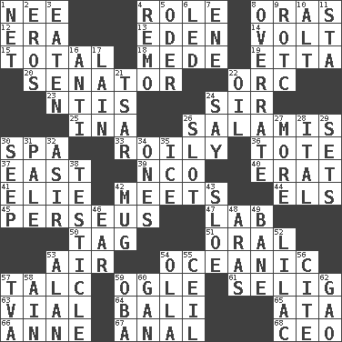 ACROSS 1. Born 4. Hero or heavy, e.g. 8. Mouths or openings 12. Period 13. Genesis locale 14. Electrical Unit 15. "_____ Recall" 18. Ancient Persian 19. Singer James 20. Elected representative 22. The grampus (Milton) 23. Nuclear Threat Initiatives 24. Title for a knight 25. _ tizzy (2 wds.) 26. Deli grouping 30. Health resort 33. Turbulent 36. Haul 37. 90 degrees 39. Non-commissioned officer (abbr.) 40. Part of Q.E.F. 41. Writer Wiesel 42. Confronts 44. Raised railways 45. Son of Zeus who helped slay Medusa 47. Experiment locale 50. Label 51. Spoken 53. Wind 54. Pertaining to the sea 57. Baby powder 59. Stare 61. Major League Baseball Commissioner Bud 63. Small bottle 64. Indonesian resort city 65. _ moment's notice (2 wds.) 66. Singer Murray 67. Of or related to the anus 68. Corporate head (abbr.) DOWN 1. Fish or hair follower 2. Greek god of love 3. Ingested 4. San ____ (Riviera town) 5. River in Europe 6. Directed 7. Compass dir. 8. Make much ado about nothing 9. College mil. group 10. The first octave above the treble staff 11. R.R. building 16. Opposed to 17. (Had) reclined 21. Russian ruler of old 22. Petroleum 24. Declare 26. Position in a hierarchy or organization 27. Greater amount 28. Slanted text style (abbr.) 29. Arranges properly for use 30. Ooze 31. Light colored 32. SW Saudi Arabia district 34. Singles 35. Frozen water 38. A testis 42. Large cup 43. _ gin 46. Hearing organ 48. Ancient river in northeast Turkey 49. Object of repulsion 52. Pale purple color 53. Actor Alda or Thicke 54. Rounded earthenware pot or jar 55. To provide with a ceiling 56. Quote 57. Federal power corp. 58. The 18th letter of the Arabic alphabet 59. Chief or king in Benin or Nigeria 60. Separate the seeds from cotton 62. E Mali city