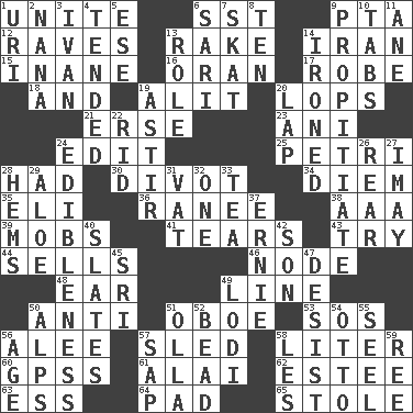 ACROSS 1. Join together 6. Fast jet (abbr.) 9. Parent Teacher Assoc. 12. All-night dance parties 13. Immoral or dissolute person 14. SW Asia republic 15. Empty; void 16. Northwest Algerian city 17. Loose flowing garment 18. Also 19. Set down 20. Chops off 21. Celtic language 23. Black tropical American cuckoo 24. Prepare for publication 25. _ dish (used to culture cells) 28. Possessed 30. A piece of turf (Scot.) 34. South Vietnam president (1954) 35. Connecticut Ivy Leaguer 36. Indian princess (variant) 38. American Automobile Association (abbr.) 39. Crowds into 41. Rends 43. Attempt to accomplish something 44. Exchanges for money 46. Connecting point 48. Ewer handle 49. Actor's bit 50. Against 51. Mitch Miller's instrument 53. Mayday 56. Toward shelter 57. Downhill vehicle 58. 61 cubic inches 60. Global Positioning Systems (abbr.) 61. Jai ____ 62. First name in cosmetics 63. Curvy letter 64. Groovy apt. 65. Fur scarf DOWN 1. RI univ. 2. Grandmother 3. "Terrible" tsar 4. Watched over 5. Compass dir. 6. Indian skirt 7. Three-handed card game 8. "___ Little Indians" 9. Appease 10. Bar bills 11. A saturated hydrocarbon 13. Hero or heavy, e.g. 14. Pressed 19. Moving about 20. Infant locale 22. To free from 24. The property of being fit to eat 26. Located in or toward the back 27. "If ____ say so..." 28. Folds over and sews together 29. _ vera 31. Large container 32. Single 33. Afternoon social gathering 37. Bert's buddy 40. Chalkboards 42. Manchild 45. _ Lanka 47. Stop 49. Farming town in central California 50. High mountains 51. Spanish pot 52. Necklace unit 54. Von Bismarck 55. Stitch closed the eyes of (a falcon) 56. Ripen 57. Plant excrement 58. French article 59. To sift