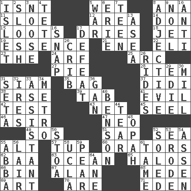 ACROSS 1. Is not 5. Soggy 8. Santa ___, CA 11. _ gin 12. Length times width 14. Spanish title 15. Plunders 17. Frees from moisture 18. _ stream 19. Gist 21. Compass dir. 22. Connecticut Ivy Leaguer 23. Definite Article 24. Sandy's bark 25. Curve 27. Sliced dessert 28. Detail 31. Thailand, formerly 35. Paper or plastic container 37. "You Light Up My Life" star Conn 38. Celtic language 39. Bar bill 41. Tending to cause great harm 42. Trial 43. Fish or hair follower 45. Sew up the eyelids of hawks and falcons 46. SW Saudi Arabia district 47. Modern: prefix 49. Distress signal 51. Plant excrement 52. Ocean 55. Keyboard modifier key 57. Uncastrated adult male sheep 60. Speakers 62. Sound made by sheep 63. Sea 65. Rings 66. Storage container 67. Actor Alda or Thicke 68. Ancient Persian 69. Tate display 70. "We ___ not amused" (Victoria) 71. Locale of original sin DOWN 1. Small island 2. Splash clumsily 3. Trap for birds or small mammals 4. False hair 5. Armed conflict 6. One of the Great Lakes 7. Adolescent 8. Descriptive word 9. Christmas carol 10. Opposed to 13. At sea 16. Fastener 17. Outscore 20. Baby bed with high sides 26. Amusement-park features 29. Singer Brickell 30. Place where flour is made 31. Bristle 32. Angers 33. Helper 34. Paris' subway 36. Separate the seeds from cotton 40. Gillaume's butler role 44. Pull apart 48. Brightly colored fish 50. Portico 52. Having a sole or soles 53. Wear away 54. NE Netherlands city 55. Swedish rock group 56. Den 58. Southern CA. univ. 59. Lightbulb-shaped fruit 61. Not wild 64. One (Scot)