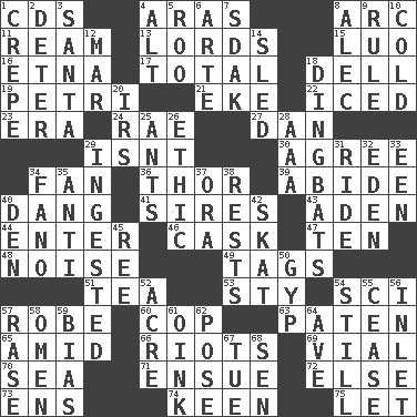 ACROSS 1. Music discs 4. Ancient river in northeast Turkey 8. Curve 11. 480, 500 or 516 sheets of paper 13. Domineers 15. Nilotic language 16. Inactive volcano in Sicily 17. "_____ Recall" 18. Small valley 19. _ dish (used to culture cells) 21. Make supply last 22. On the rocks 23. Period 24. Actress Charlotte 27. Daniel's nick name 29. Is not 30. Match 34. Air blower 36. Son of Odin 39. Tolerate 40. Mild oath, euphamism for damn 41. Fathers 43. Arabian gulf 44. Keyboard key 46. Keg 47. Nine, plus one 48. Annoying sound 49. Labels 51. Beverage made from leaves 53. Filthy place 54. _-fi 57. Loose flowing garment 60. Police officer (slang) 63. Eucharist need 65. Among 66. Debaucheries 69. Small bottle 70. Ocean 71. Follow as a consequence or result 72. Otherwise 73. Followers of ems 74. Peachy ____! 75. Allow DOWN 1. Streamer paper 2. Prevent from occurring 3. Before Barbara or Clara 4. The first octave above the treble staff 5. Friend of Pooh 6. Johnson of "Laugh-In" 7. Neighbor of Neb. 8. Actor Baldwin 9. Governing power 10. Having a low temperature 12. Third mo. 14. Downhill vehicle 18. Empty-headed or silly people 20. Big collection agency 25. Pismires 26. Moral principle 28. Auto club (abbr.) 29. Eaten 31. Travel on or in a vehicle 32. Paradise 33. Car or cant ending 34. Papal veil 35. Against 37. Mouth or opening 38. Musical pauses 40. Lair 42. Three-handed card game 45. To separate or throw off 50. Hustle 52. 43,560 square feet 54. Not moving 55. Desist 56. An arm off of a larger body of water 57. To erase 58. Sign of something about to happen 59. Prejudice 61. Pig sound 62. Airs 64. "___ Maria" 67. Third day of the wk. 68. Elected rep.