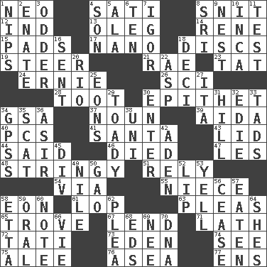ACROSS 1. Modern: prefix 4. Suttee (variant) 8. In a ____ (agitated or irritated) 12. Indiana (abbr.) 13. Cassini of fashion 14. French philosopher Descartes 15. Groovy apts. 17. Billionth: prefix 18. Plates 19. Navigate 21. Actress Charlotte 23. Make lace 24. Bert's buddy 26. _-fi 28. A blast of a horn 30. Curse 34. Girls' org. (abbr.) 37. Part of speech 39. Opera by Verdi 40. Personal Computers (abbr.) 41. Before Barbara or Clara 43. Hat (slang) 44. Expressed in words 46. Passed on 47. French article 48. Slender, wiry 51. Have trust in 54. By way of 55. Sibling's daughter 58. A really long time 61. Trim (branches) 63. Entreaties 65. Collection of objects 67. Grant temporary use of 71. Thin strip of wood or metal 72. Jacques of French films 73. Paradise 74. Observe 75. Toward shelter 76. At sea 77. Followers of ems DOWN 1. Cuts off 2. Maternal 3. More peculiar 4. Male child 5. In the manner of 6. "___ Little Indians" 7. Russian composer Stravinsky 8. Indian title of respect (Mr.) 9. A home for chicks 10. South American Indian 11. Trial 16. Emitted 18. Tenth: prefix 20. _ de Janeiro 22. Cleo's killer 25. Immeasurably long periods of time 27. Call ___ day 29. Sycophant 30. Keyboard key 31. Land elevation 32. Singer Brickell 33. Small amounts or degrees 34. Global Positioning Systems (abbr.) 35. Scram, to a cat 36. SW Saudi Arabia district 38. University (slang) 42. An important port of Yemen 45. HTML Container Element 49. The longest river in the world 50. E Mali city 52. Mouth edge 53. Shout 56. Desist 57. Consumed 58. Singer James 59. Taken by mouth 60. Observe 62. Entreaty 64. "______ My Girl" (Turtles hit) 66. Compete 68. Begley and Asner 69. Born 70. Heredity factor (abbr.)
