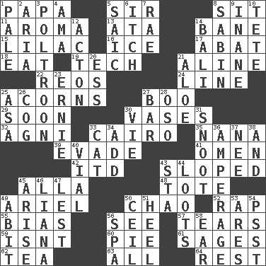 ACROSS 1. Dad 5. Title for a knight 8. Be seated 11. Scent 13. _ moment's notice (2 wds.) 14. Object of repulsion 15. Pale purple color 16. Frozen water 17. Blind as ____ 18. Consume 19. Georgia ____ (Atlanta school) 21. Place in a line 22. Vintage cars 24. Actor's bit 25. Oak nuts 27. Sometimes accompanies a hiss 29. Within a short period 30. Flower holders 32. Hindu god of fire 33. Capital of Egypt 35. Grandmother 39. Dodge 41. Presage 42. It would 43. Inclined 45. Silent film actress Nazimova 48. Carry 49. Satellite of Uranus 50. US Secretary of Labor Elaine L. _ 52. Strike 55. Prejudice 56. Perceive with the eye 57. Pulls apart 59. Is not 60. Sliced dessert 61. Gurus 62. Afternoon social gathering 63. Everything 64. Remainder DOWN 1. Diluted with white 2. Roberta Peters solo 3. Characterized by complete cowardliness 4. Nursemaid (var.) 5. Ketch in the Levant 6. Hankering 7. Actress Charlotte 8. Unit of acoustic absorption 9. Empty; void 10. False hair 12. NE Massachussets city 14. Indonesian resort city 20. Double-curved letter 21. Medicinal plant 23. Bert's buddy 25. White ___ sheet 26. Gear tooth 27. Long, evenly shaped piece 28. Bear (Spanish) 30. Compete 31. Snob 33. Domesticated feline 34. Increase 36. Electrical Measurement 37. Born 38. Added to 40. Small bottle 43. R.R. building 44. Plunders 45. Originate 46. Woody, climbing, usually tropical plant 47. For fear that 49. "This won't hurt ____!" 50. To provide with a ceiling 51. Person who is morally reprehensible 53. Ancient Greek god of war 54. Inconspicuous attention getter 56. Health resort 58. Ewer handle