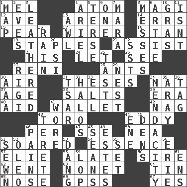 ACROSS 1. Cartoonist voice _ Blanc 4. Smallest unit of an element 8. Wise men 12. "___ Maria" 13. Sports stadium 14. Blunders 15. Lightbulb-shaped fruit 17. One who wires 18. Comedian Laurel of Laurel & Hardy 19. Paper fasteners 21. Aid 23. Part of HMS, perhaps 24. Allow 26. Observe 27. Painter Guido (1575-1642) 28. Pismires 30. Wind 31. College papers 34. Floor protector 37. Grow older 38. Table seasonings 39. Epoch 40. Help 41. Place for singles 42. Tired old horse 43. "Corrida" creature 44. Whirlpool 46. For each 47. Compass dir. 50. Teachers' org. 51. Flew 54. Center 57. Writer Wiesel 58. Having winglike extensions 60. Beget 62. Left 63. Music written for nine 64. Shallow baking pan 65. Olfactory organ 66. Global Positioning Systems (abbr.) 67. Consenting reply DOWN 1. Atlas unit 2. Nights before holidays 3. Resembling or made to resemble leather 4. Satellite of Uranus 5. Laconic 6. Single 7. Hindu Mythology: god of death 8. Makes clutter 9. Nick name for Arthur 10. Pate de foie ____ 11. Is not 13. Leather borer 16. Precipitation 20. 23rd letter of the Greek alphabet 22. Fast planes 25. Clothes sense 27. Swiss mountan, "Queen of the Mountains" 29. Egg locale 30. Auto club (abbr.) 31. Russian ruler of old 32. Rings 33. Pipe bend 34. Ananias' fault 35. Like ___ of sunshine 36. Label 41. Had on 43. Cylindrical with tapered ends 44. Compass dir. 45. Cub Scout units 46. Aches 48. Actors Connery and Penn 49. _____ Park, CO 51. Stitched 52. Butter sub 53. Mild oath, euphamism for damn 55. Put into a specified state 56. One of the Great Lakes 59. Chop off 61. Followers of ems