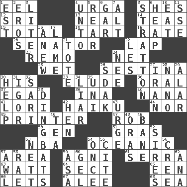 ACROSS 1. Snakelike fish 4. Capital and largest city of Mongolia 8. "______ My Girl" (Turtles hit) 12. Indian title of respect (Mr.) 13. Actress Patricia 14. Beverages made from leaves 15. Add up to 18. Small pie 19. Assign a rank or rating to 20. Legislator 22. Pet locale 23. San ____ (Riviera town) 24. Fish or hair follower 25. Dripping 26. French poetic form 30. Part of HMS, perhaps 33. Dodge 36. Of the mouth 37. Mild oath 39. _ tizzy (2 wds.) 40. Grandmother 41. Australian parrot (variant) 42. Japanese poetic form 44. And not 45. Hard copy producer 47. Director Reiner 50. Commissioned mil. rank 51. Pate de foie ____ 53. Basketball assoc. 54. Pertaining to the sea 57. Length times width 59. Hindu god of fire 61. Spanish missionary in California 63. Electrical Unit 64. Religious group 65. Car or cant ending 66. Allows 67. Toward shelter 68. Ocean DOWN 1. Eastern Standard Time (abbr.) 2. Greek god of love 3. 61 cubic inches 4. To (old English) 5. Bring up, as a child 6. Slender fish 7. The first octave above the treble staff 8. Ski resort town in Vermont 9. Pile 10. Erode 11. Compass dir. 16. Afresh 17. Unable to walk 21. Lug 22. French article 24. Born 26. Neighbor of Neb. 27. SW Asia republic 28. Billionth: prefix 29. Having or resembling wings 30. Aid 31. Russian composer Stravinsky 32. Indian skirt 34. One who doesn't tell the truth 35. University (slang) 38. Empty-headed or silly people 42. Layer 43. Goad 46. Afternoon social gathering 48. Mouths or openings 49. Object of repulsion 52. Founders of families 53. Remaining after all deductions 54. Single time 55. Quote 56. Algonquian 57. Leather borer 58. Actress Charlotte 59. White ___ sheet 60. Set 62. Santa ___, CA