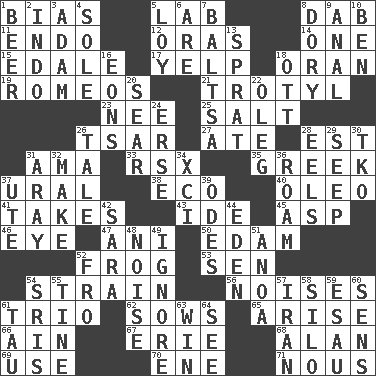 ACROSS 1. Prejudice 5. Experiment locale 8. Small moist lump or mass 11. Inside; within (prefix) 12. Mouths or openings 14. Single 15. Peak District village in England 17. Sharp bark 18. NW Algerian seaport 19. Lover boys 21. Trinitrotoluene 23. Born 25. Table seasoning 26. Russian ruler of old 27. Had dinner 28. Eastern Standard Time (abbr.) 31. Nanny (var.) 33. Acura sports coupe 35. Of Greece 37. Mountain range 38. Environmental prefix 40. Margarine 41. Proceeds 43. Binary compound 45. Cleo's killer 46. Sight organ 47. Black tropical American cuckoo 50. Dutch treat 52. Toadlike animal 53. Elected rep. 54. Put through a sieve 56. Annoying sounds 61. Musical group of three 62. Sty mamas 65. Get up 66. The 18th letter of the Arabic alphabet 67. One of the Great Lakes 68. ____ Jay Lerner 69. Purpose 70. Compass dir. 71. Good sense DOWN 1. Fermented drink made from hops 2. _ china 3. First of billions? 4. Flatfish 5. Myrna of the movies 6. "We ___ not amused" (Victoria) 7. Greek mezzo-soprano Agnes 8. Dinghy 9. Of or related to the anus 10. Benjamin's nick name 13. Small fatty European fish 16. Immeasurably long periods of time 18. Baseball player Mel 20. Shrivel 22. Cassini of fashion 24. Celtic language 26. Story 28. Snakelike fish 29. Ooze 30. Ring climax 31. Like ___ of sunshine 32. Create 34. One more than ninety 36. Wander aimlessly 37. Shoshoni 39. Lyric poems 42. "Two Mules for Sister ____" 44. Genesis locale 48. Annoying sound 49. Fail to notice 51. Small Philippine buffalo 52. Back 54. Indian titles of respect 55. Prong on a fork 57. SW Asia republic 58. Grain storage tower 59. He sold his birthright 60. Elected reps. 61. The 19th letter of the Greek alphabet 63. Victory 64. Observe