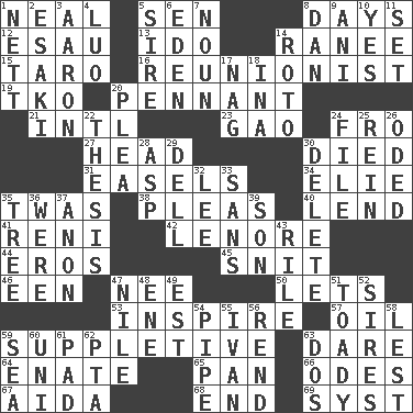 ACROSS 1. Actress Patricia 5. Elected rep. 8. 24-hour periods 12. Son of Isaac 13. Wedding promise 14. The wife of a rajah (variant) 15. Edible starchy tuberous root 16. One who advocates reunion 19. Ring climax 20. Pre-World Series prize 21. International (abbr.) 23. E Mali city 24. Back 27. Froth on beer 30. Passed on 31. Artist's stands 34. Writer Wiesel 35. It was, poetically 38. Entreaties 40. Grant temporary use of 41. Painter Guido (1575-1642) 42. Poe poem 44. Greek god of love 45. In a ____ (agitated or irritated) 46. Car or cant ending 47. Born 50. Allows 53. Stimulate to action 57. Petroleum 59. Supplementary 63. Have the gumption 64. Related on the mother's side 65. Baking dish 66. Lyric poems 67. Opera by Verdi 68. Conclude 69. System (abbr.) DOWN 1. Remaining after all deductions 2. 1973 Nobel Price Winner (Physics) Leo 3. Composer Copland 4. Nilotic language 5. The founder of a family 6. Locale of original sin 7. Part of speech 8. Daniel's nick name 9. Cuckoo 10. It is so 11. Put into a specified state 14. Printing process, for short 17. Tired old horse 18. _ tizzy (2 wds.) 20. Entreaty 22. College paper 24. Do some clerical work 25. It's straight from the horse's mouth 26. Wrote a lyric poem 28. Cleo's killer 29. Small valley 30. Keyboard key 32. Area sheltered from the wind 33. Without 35. Relationship diagram 36. We are 37. Soon (poet.) 39. Manchild 43. Cause heat under the collar 47. "Death on the ____" 48. Compass dir. 49. Eastern Standard Time (abbr.) 51. Sycophant 52. Male parents of animals 54. Corncob 55. "Terrible" tsar 56. Tear apart 58. For fear that 59. Ocean 60. Corn or form start 61. Groovy apt. 62. Parent Teacher Association (abbr.) 63. Two (Sp.)