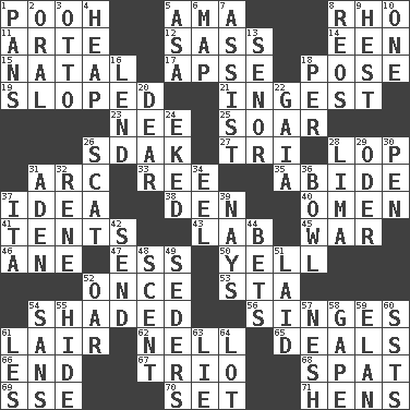 ACROSS 1. "Silly old bear" 5. Wet nurse (var.) 8. 17th letter of the Greek alphabet 11. Johnson of "Laugh-In" 12. Backtalk 14. Car or cant ending 15. Relating to or accompanying birth 17. Domed church section 18. Airs 19. Inclined 21. Swallow 23. Born 25. Fly high 26. Neighbor of Neb. 27. Three (prefix) 28. Chop off 31. Curve 33. To separate or throw off 35. Tolerate 37. It may be bright or harebrained 38. Lair 40. Sign of things to come 41. Portable shelters 43. Experiment locale 45. Armed conflict 46. A saturated hydrocarbon 47. Curvy letter 50. Shout 52. Single time 53. R.R. building 54. Cast a shadow over 56. Burns superficially 61. Den 62. 1994 drama film starring Jodie Foster 65. Allots cards 66. Conclude 67. Musical group of three 68. Argument over a trivial matter 69. Compass dir. 70. Arrange properly for use 71. Coop moms DOWN 1. Baking dishes 2. Of the mouth 3. Von Bismarck 4. Pile 5. White ___ sheet 6. Atlas unit 7. Aid 8. Vintage cars 9. Command 10. Single 13. Sir (Sp.) 16. Grant temporary use of 18. For each 20. Letter starter 22. Greek goddess of the earth (variant) 24. Supplemented with great effort 26. Jazz singing style 28. Pale green bean 29. River in Europe 30. Animal enclosure 31. An important port of Yemen 32. French philosopher Descartes 34. Snakelike fish 36. Soup holder 37. Call ___ day 39. Negative votes 42. Post 44. Wagers 48. Aroma 49. Spring feasts 51. Put down 52. Rowing implement 54. Without 55. Flintstone garb 57. Delicate 58. Stare wonderingly 59. Enthusiasm 60. Fast planes 61. French article 63. Whopper 64. Car dealer's back yard