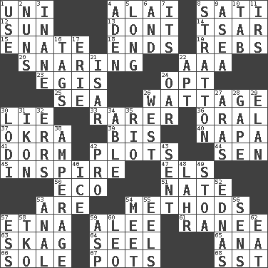 ACROSS 1. Single; one (prefix) 4. Jai ____ 8. Suttee (variant) 12. Player for Phoenix 13. Do not 14. Russian ruler of old 15. Related on the mother's side 18. Conclusions 19. Confederate soldiers (slang) 20. Catching in a trap 22. American Automobile Association (abbr.) 23. Armor plate that protects the chest 24. Choose 25. Ocean 26. Electrical Measurement 30. Whopper 33. More valued for its uncommonness 36. Spoken 37. Gumbo ingredient 39. Again 40. California wine valley 41. Dormintory (informal) 42. Small pieces of grounds 44. Elected rep. 45. Motivate 47. Raised railways 50. Environmental prefix 51. Nathan's nickname 53. "We ___ not amused" (Victoria) 54. Modes 57. Inactive volcano in Sicily 59. Toward shelter 61. Indian princess (variant) 63. Heroin 64. Sew up the eyelids of hawks and falcons 65. Santa ___, CA 66. Not divided or shared with others 67. Plant holders 68. Fast jet (abbr.) DOWN 1. Purpose 2. Religious women 3. Lacking in sense or substance 4. Arabian gulf 5. Protracted 6. Also 7. ___ a Wonderful Life 8. Ski resort town in Vermont 9. Toward the sea 10. Keyboard key 11. Big collection agency 16. Labels 17. 4th largest of the Great Lakes 21. Austrian river, tributary to the Danube 22. Fitting 24. Rowing implement 26. 270 degrees 27. Caspian sea tributary 28. Stare wonderingly 29. Liveliness 30. Farming town in central California 31. Visual representation of an object 32. Blunders 34. Competent 35. River (Sp.) 38. Electrical Measurement 42. Adept person 43. Posted 46. Frozen water 48. Cowardly lion portrayer 49. Portico 52. Ferber et al. 53. Of or related to the anus 54. Confront 55. Snakelike fish 56. Elected reps. 57. Curvy letter 58. Ring climax 59. Viper 60. Lion 62. Ingest