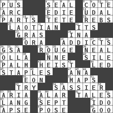 ACROSS 1. Fluid product of inflammation 4. Lick closed 8. ____ d'Azur (French Riviera) 12. Curve 13. Singer Brickell 14. Freehold land 15. Pieces 18. False hair 19. Confederate soldiers (slang) 20. Of or relating to Laos or its people 22. ___ a Wonderful Life 23. Pate de foie ____ 24. _ tizzy (2 wds.) 25. Mouth or opening 26. Inveterate users 30. Girls' org. (abbr.) 33. Makeup applied to the cheeks 36. Actress Patricia 37. Water jar 39. Compass dir. 40. Filth; sediment 41. Inside of hand 42. Robbery 44. Directed 45. Paper fasteners 47. Santa ___, CA 50. Period of immesurable duration 51. Atlas contents 53. Attempt 54. More disrespectful 57. Roberta Peters solo 59. Having or resembling wings 61. Falsehoods 63. Austrian-born American filmmaker Fritz 64. Back-to-school mo. 65. Wedding promise 66. Domed church section 67. Airs 68. Thick or sticky substance DOWN 1. Infant food 2. Mountain range 3. Strangle with an iron collar 4. Stalk of a moss capsule 5. Genesis locale 6. Small island 7. Area sheltered from the wind 8. Window treatments 9. Lyric poems 10. Keyboard key 11. Raised railways 16. "Corrida" creature 17. Play the lead 21. Austrian river, tributary to the Danube 22. Working for oneself (abbr.) 24. Binary compound 26. Ripens 27. To provide with a ceiling 28. Falsehood 29. Downhill vehicle 30. Republicans 31. Narrow board 32. Silent film actress Nazimova 34. Washington bills 35. Corn or form start 38. Electrical Measurement 42. Layer 43. Scottish caps 46. Myrna of the movies 48. Political cartoonist Thomas 49. Capital of Western Samoa 52. Major League Baseball Commissioner Bud 53. Canisters 54. Plant excrements 55. Johnson of "Laugh-In" 56. Make new 57. According to 58. Reproach for some lapse or misdeed 59. Cleo's killer 60. Lion 62. "Barney Miller" actor Jack