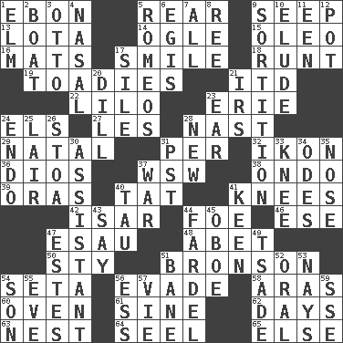 ACROSS 1. Inky black, to poets 5. Bring up, as a child 9. Ooze 13. Globular water bottle used in Asia 14. Stare 15. Butter sub 16. Floor protectors 17. Grin 18. Undersized animal 19. Sycophants 21. It would 22. _ and Stitch 23. 4th largest of the Great Lakes 24. Raised railways 27. French article 28. Political cartoonist Thomas 29. Relating to or accompanying birth 31. For each 32. Image 36. "Vaya con ____" 37. Compass dir. 38. Southwest Nigerian state 39. Mouths or openings 40. Make lace 41. Leg joints 42. Austrian river, tributary to the Danube 44. Enemy 46. Compass dir. 47. Son of Isaac 48. Collude with 50. Filthy place 51. "Death Wish" actor 54. Bristle 56. Elude 58. Ancient river in northeast Turkey 60. Baking chamber 61. Trig term 62. 24-hour periods 63. A home for chicks 64. Sew up the eyelids of hawks and falcons 65. Otherwise DOWN 1. Shade tree 2. Water vessel 3. "Beetle Bailey" pooch 4. Relating to the nose 5. Lover boys 6. The front part of a cuirass 7. Everything 8. To separate or throw off 9. Making a chance decision by using lots 10. Dodge 11. Car or cant ending 12. Cooking vessel 17. Drop; flow; fall 20. Deli pickle 21. Big collection agency 23. Hearing organ 24. Inside; within (prefix) 25. Den 26. Portico 28. ___ Haven, CT 30. Aide 31. Pacific Standard Time (abbr.) 33. Leg joint 34. Lyric poems 35. Sense of smell 37. Armed conflict 40. The 19th letter of the Greek alphabet 41. Peachy ____! 43. Declare 44. Burden 45. Mitch Miller's instrument 47. _____ Park, CO 49. Sadhe (variant) 51. Object of repulsion 52. Spoken 53. Negative votes 54. Male child 55. Night before a holiday 56. Curvy letter 57. Compete 59. Compass dir.