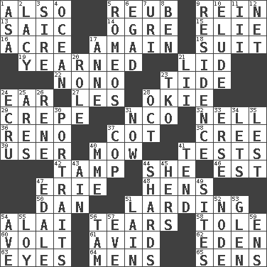 ACROSS 1. In addition 5. Reuben's nickname 9. It's straight from the horse's mouth 13. Ketch in the Levant 14. Legendary monster 15. Writer Wiesel 16. 1/640 square mile 17. At full speed 18. Costume for a special activity 19. Had a strong desire 21. Flaplike covering 22. Words to Nanette 23. Periodic rise and fall of the sea level 24. Ewer handle 27. French article 28. Migrant worker of the '30s 29. Streamer paper 31. Non-commissioned officer (abbr.) 32. 1994 drama film starring Jodie Foster 36. Former U.S. Attorney General Janet 37. Small bed 38. Algonquian 39. One who makes use of a thing 40. Cut the grass 41. Trials 42. Pack (down) 44. A female animal or person 46. Eastern Standard Time (abbr.) 47. 4th largest of the Great Lakes 48. Coop moms 50. One of the 12 tribes of Israel 51. Preparing or cooking with lard 54. Jai _ 56. Pulls apart 58. Lacquered or enameled metalware 60. Electrical Unit 61. Enthusiastic 62. Paradise 63. Sight organs 64. Not women's 65. Elected reps. DOWN 1. White ___ sheet 2. Made of lace 3. Male parent of an animal 4. Sea 5. Lover boys 6. Mild oath 7. RI univ. 8. Benjamin's nick name 9. Home 10. Dodge 11. One more than two 12. Fish or hair follower 17. Queen of England 1702-14 20. Hero or heavy, e.g. 21. Cards in a Roman deck? 23. Ring climax 24. Shade of tan 25. Ancient Greek god of war 26. French philosopher Descartes 28. Sep. follower 30. Likenesses of persons 31. At this time 33. Celtic language 34. Allows 35. For fear that 37. Police officer (slang) 40. Madame (abbr.) 41. Watch over 43. The 18th letter of the Arabic alphabet 44. Pottery fragments 45. Possessive pronoun 47. Peak District village in England 49. Locates 51. (Had) reclined 52. Thickened enlargement 53. Small, secluded valley 54. "___ Maria" 55. Myrna of the movies 56. Scottish cap 57. First lady 59. Followers of ems