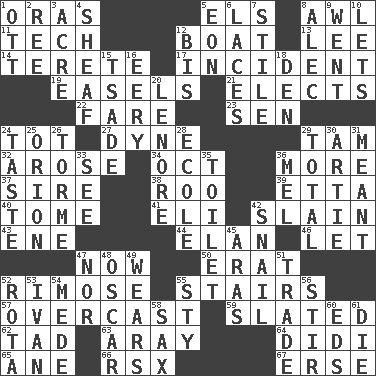 ACROSS 1. Mouths or openings 5. Raised railways 8. Leather borer 11. Technician 12. Water vessel 13. Area sheltered from the wind 14. Cigar-shaped 17. Happening 19. Artist's stands 21. Chooses 22. Conductor's collection 23. Elected rep. 24. Small child 27. Unit of force 29. Scottish cap 32. Came up 34. Sep. follower 36. Greater amount 37. The founder of a family 38. Friend of Pooh 39. Singer James 40. Heavy book 41. Biblical high priest 42. Killed 43. Compass dir. 44. Flair 46. Allow 47. At this time 50. Part of Q.E.F. 52. Full of chinks, cracks, or crevices 55. Flight of steps 57. Cloudy 59. Scheduled 62. Small boy 63. Like ___ of sunshine 64. "You Light Up My Life" star Conn 65. A saturated hydrocarbon 66. Acura sports coupe 67. Celtic language DOWN 1. Baseball player Mel 2. To separate or throw off 3. Land measure 4. To gather and bind into a bundle 5. Age 6. Shoestrings 7. Vertical member of a panel or frame 8. Actor Baldwin 9. Gone 10. Allows 12. Altar cloth linen 15. Sadhe (variant) 16. Suggestive of the supernatural 18. Lair 20. Poe poem 24. Clothes sense 25. Constellation of myth 26. Singer Mel 28. Learning spot: Fr. 29. Add up to 30. Nick name for Arthur 31. Intended 33. Perceive with the eye 35. Rest room 36. Cartoonist voice _ Blanc 42. Slow-paced one 45. Ancient river in northeast Turkey 47. Or not 48. Witty Wilde 49. Erodes 51. Exchange 52. Roll call or roster of names 53. _ the terrible 54. Ancient Persian 55. Filthy place 56. Use a swizzle stick 58. Saxophone 60. Begley and Asner 61. Pass on