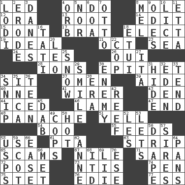 ACROSS 1. Directed 4. Southwest Nigerian state 8. Undercover agent 12. Mouth or opening 13. Carrot, for example 14. Prepare for publication 15. Do not 17. Naughty child 18. Choose 19. Perfect 21. Sep. follower 23. Ocean 24. _____ Park, CO 26. Fr. "Yes" 28. Charged atoms 30. Curse 34. Be seated 37. Sign of things to come 39. Helper 40. Compass dir. 41. One who wires 43. Lair 44. On the rocks 46. Unable to walk 47. Conclude 48. Flamboyance 51. Shout 54. Oct. 31 cry 55. Gives food to 58. Purpose 61. Parent Teacher Association (abbr.) 63. Empty completely 65. Fraudulent business schemes 67. "Death on the ____" 71. "Two Mules for Sister ____" 72. Introduce or present, as a question 73. Nuclear Threat Initiatives 74. Animal enclosure 75. Proofreading order 76. Singer Brickell 77. Double-curved letter DOWN 1. Farming town in central California 2. Wear away 3. Natives or inhabitants of Denmark 4. Globe 5. And not 6. ___ good deed 7. Von Bismarck 8. Cartoonist voice _ Blanc 9. Lyric poems 10. Louse (plural) 11. Singer James 16. Jacques of French films 18. Needle holder 20. Lion 22. Police officer (slang) 25. Frozen precipitation 27. Call ___ day 29. Grin 30. Foe 31. Flintstone garb 32. Genesis locale 33. Watch over 34. Clip 35. South American Indian 36. Adolescent 38. Period 42. Coral ridge 45. Small moist lump or mass 49. 911 reaches them 50. Being at a high temperature 52. French article 53. Allows 56. Window treatment 57. Male parents of animals 58. United States Postal Service (abbr.) 59. Highlander 60. Relaxation 62. Queen of England 1702-14 64. Baking dishes 66. Was introduced to 68. It would 69. Cards in a Roman deck? 70. Compass dir.