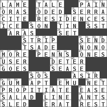 ACROSS 1. Unable to walk 5. Story 9. Ache 13. Mouths or openings 14. Wrote a lyric poem 15. Spanish missionary in California 16. Quote 17. Homes 19. Frozen water 20. Male child 21. Shallow baking pan 22. Fast jet (abbr.) 23. Ancient river in northeast Turkey 25. Put into a specified state 26. Long narrow piece of something 30. Post 34. Sadhe (variant) 35. Words to Nanette 36. Greater amount 39. Actor Sean's family 42. Singles 43. One who makes use of a thing 44. Prevent from occurring 46. Moves 47. Gospel singer Marvin 48. Mayday 51. SW Saudi Arabia district 54. Chewing product 57. Fitting 58. Australian flightless bird 60. Fish or hair follower 62. Appease 65. Relaxation 66. Vegetable dish 67. Actor's bit 68. Pismires 69. Downhill vehicle 70. Part of Q.E.F. 71. State of inaction DOWN 1. Event scenes 2. N. Chile seaport 3. Mother 4. Compass dir. 5. "Corrida" creature 6. An important port of Yemen 7. French article 8. Prepares for publication 9. Fenced enclosure 10. Curves 11. Angers 12. Political cartoonist Thomas 15. Emitted 18. Pass on 20. Fast planes 24. Michaelmas daisies 27. Hit sharply and swiftly 28. Binary compound 29. Hangs 30. Sounds asleep 31. A really long time 32. Compass dir. 33. Two (Sp.) 36. Large cup 37. Bear (Spanish) 38. To riddle 40. Born 41. R.R. building 45. He sold his birthright 48. Alleged 49. Choose 50. Vertical member of a panel or frame 52. Lacking in sense or substance 53. Musical pauses 54. Global Positioning Systems (abbr.) 55. Mountain range 56. Undercover agent 58. Inactive volcano in Sicily 59. Rendezvous 61. Trial 63. Writing tablet 64. Wind 65. Ewer handle
