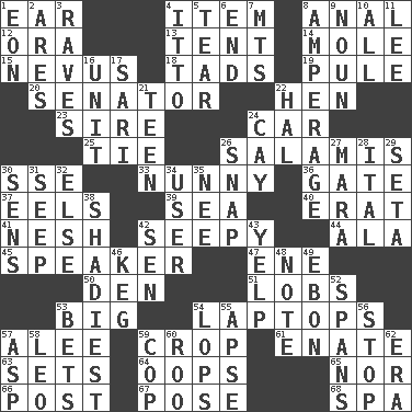 ACROSS 1. Ewer handle 4. A whole individual unit 8. Of or related to the anus 12. Mouth or opening 13. Portable shelter 14. Undercover agent 15. Mole, birthmark 18. Small amounts or degrees 19. Whine 20. Legislator 22. Layer 23. The founder of a family 24. 4-wheeled motor vehicle 25. Make a knot 26. Deli grouping 30. Compass dir. 33. Pet term 36. Yard entry 37. Snakelike fish 39. Ocean 40. Part of Q.E.F. 41. Tender 42. Oozy 44. Insect wing 45. Orator 47. Compass dir. 50. Lair 51. Tennis shots 53. Of large size 54. Portable computers 57. Toward shelter 59. Riding implement 61. Maternal 63. Puts into a specified state 64. I made a mistake 65. And not 66. Mail 67. Introduce or present, as a question 68. Health resort DOWN 1. Period of immesurable duration 2. Ancient Greek god of war 3. All-night dance parties 4. "Tell ____ the Marines!" 5. Pull into pieces 6. Conclusion 7. Mountains (abbr.) 8. Electrical Measurement 9. Part of speech 10. 100% 11. Area sheltered from the wind 16. A single undivided whole 17. Indian skirt 21. Adolescent 22. Actor Linden 24. Island 26. Fastener 27. Hindu Mythology: god of death 28. Slanted text style (abbr.) 29. Bristle 30. Elected reps. 31. Ooze 32. Otherwise 34. One who makes use of a thing 35. Born 38. Most dark, concealed or hidden 42. Elected rep. 43. Sharp bark 46. Barrel 48. Short letter 49. Inky black, to poets 52. Connects, as a bridge 53. Stakes 54. Chops off 55. Domed church section 56. Discontinue 57. Cleo's killer 58. Lion 59. Police officer (slang) 60. Friend of Pooh 62. Period