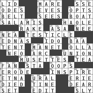 ACROSS 1. Hat (slang) 4. Female horse 8. Compass dir. 11. Lyric poems 13. Nights before holidays 14. Chooses 15. Waist strap 16. Observes 17. Water vessel 18. Deli grouping 21. White Person, in Hawaii 22. Libertine 23. White ___ sheet 25. Born 26. Teachers' org. 29. One of the two male reproductive glands 32. Ferber et al. 34. Wedding promise 35. Sound made by sheep 38. Portable shelter 39. French painter Edouard 41. Water jar 43. Modern: prefix 44. Curve 45. The state of being joined or united 46. French bagpipes 50. Beverage made from leaves 51. Air blower 54. R.R. building 55. I made a mistake 57. Wear away 59. Heighten or intensify 63. Inactive volcano in Sicily 64. Mountain range 67. 4th largest of the Great Lakes 68. Passed on 69. Prong on a fork 70. Letter starter 71. Arrange properly for use 72. Prepare for publication 73. Wily DOWN 1. Tennis shots 2. The content of cognition 3. Small valley 4. Makes clutter 5. "___ Maria" 6. To separate or throw off 7. Curvy letter 8. Soup utensil 9. Showing deterioration from age 10. First name in cosmetics 12. Play the lead 14. Chief or king in Benin or Nigeria 19. Floor protectors 20. D.D.E's nickname 21. Actor Linden 23. Assistant 24. Native of Scotland 26. Fish or hair follower 27. Genesis locale 28. Queen of England 1702-14 30. Colored lightly or faintly 31. Inky black, to poets 33. Tiny particle 36. Set down 37. Medicinal plant 39. Vertical spar for supporting sails 40. Type of rug 42. Santa ___, CA 45. United States Postal Service (abbr.) 47. Purpose 48. Rest room 49. Period of immesurable duration 51. Eats 52. Nick name for Arthur 53. Music written for nine 56. Moved rapidly 58. June honoree 60. Angers 61. Monetary unit of Yemen 62. Suggestive of the supernatural 64. Shoshoni 65. To free from 66. Cuckoo
