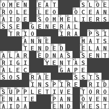 ACROSS 1. Presage 5. Erode 8. _ gin 12. Hero or heavy, e.g. 13. Lion 14. Sea 15. Assistant 16. Wine waiters 19. Compass dir. 20. Commissioned military rank 21. Musical group of three 23. Retirement account (abbr.) 24. 23rd letter of the Greek alphabet 27. Singer Murray 30. Floor protectors 31. Watched over 34. Style 35. Having or resembling wings 38. Ferber et al. 40. Transmitted 41. Swiss mountan, "Queen of the Mountains" 42. Gossips 44. Actor Baldwin 45. Stare wonderingly 46. Distress signal 47. Actress Charlotte 50. Fast planes 53. Stimulate to action 57. To free from 59. Supplying deficiencies 63. "Corrida" creature 64. Maternal 65. Baking dish 66. Baking chamber 67. Opera by Verdi 68. Conclusion 69. Compass direction DOWN 1. Mouths or openings 2. Damp 3. A person who is older than you are 4. Born 5. Otherwise 6. A really long time 7. Heavy book 8. _-fi 9. Area sheltered from the wind 10. Boat paddle 11. Followers of ems 14. Spanish pot 17. Medical imaging device (abbr.) 18. Ewer handle 20. Went 22. Of or pertaining to medicine 24. Light colored 25. Comedian Laurel of Laurel & Hardy 26. Is not 28. Compass dir. 29. Whirlpool 30. Makes clutter 32. Compass dir. 33. Mild oath, euphamism for damn 35. Caspian sea tributary 36. _ and Stitch 37. Grows older 39. R.R. building 43. Domed church section 47. Cause heat under the collar 48. A saturated hydrocarbon 49. Eastern Standard Time (abbr.) 51. Collection of objects 52. Male parents of animals 54. Corncob 55. _ the terrible 56. Tear apart 58. Do not 59. Ocean 60. Corn or form start 61. Groovy apt. 62. Parent Teacher Association (abbr.) 63. Pull behind
