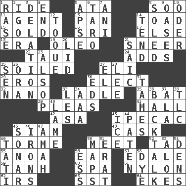 ACROSS 1. Travel on or in a vehicle 5. "One Day ___ Time" 8. "Barney Miller" actor Jack 11. Rep 13. Baking dish 14. Frog relative 15. Twentieth part of a lira 16. Indian title of respect (Mr.) 17. Otherwise 18. Period 19. Butter sub 21. Contemptuous expression 22. "Change" in Tahitian 24. Sums up 25. Dirtied 27. Connecticut Ivy Leaguer 29. Greek god of love 30. Choose 32. Billionth: prefix 33. Dipping utensil 35. Blind as ____ 39. Entreaties 41. Promenade 42. White ___ sheet 43. Medicinal drug used to evoke vomiting 45. Thailand, formerly 48. Keg 49. Singer Mel 50. Confront 52. Small boy 55. Small Philippine buffalo 56. Ewer handle 57. Peak District village in England 59. Hyperbolic tangent 60. Health resort 61. Thermoplastic polyamide 62. Big collection agency 63. Fast jet (abbr.) 64. Makes supply last DOWN 1. To erase 2. Composer Stravinsky 3. Accusation by an informer 4. Conclude 5. Domed church section 6. Pacific island yam 7. Black tropical American cuckoo 8. Having a sole or soles 9. Fertile tracts in a desert 10. Baltic tributary 12. Woman's close-fitting hat 14. Be inclined (to) 20. Hat (slang) 21. Ketch in the Levant 23. Columnist Joseph or Stewart 25. Elected rep. 26. Mouth or opening 27. Pipe bend 28. Area sheltered from the wind 30. Begley and Asner 31. Corrects by punishment or discipline 33. French article 34. American Automobile Association (abbr.) 36. Sass 37. Chicken ___ king 38. Affectionate concern, for short 40. Unable to walk 43. Frozen water 44. Eucharist need 45. Underwater navigation system 46. Removes the wrinkles 47. Nanny 49. Jacques of French films 50. Atlas contents 51. Part of Q.E.F. 53. _ vera 54. Cub Scout units 56. Double-curved letter 58. Color
