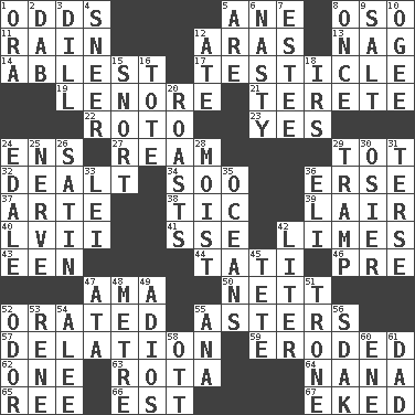ACROSS 1. Probability 5. One (Scot) 8. Bear (Spanish) 11. Water falling in drops from the sky 12. Ancient river in northeast Turkey 13. Tired old horse 14. Most capable 17. A testis 19. Poe poem 21. Cigar-shaped 22. Printing process, for short 23. Consenting reply 24. Followers of ems 27. 480, 500 or 516 sheets of paper 29. Small child 32. Started a card game 34. "Barney Miller" actor Jack 36. Celtic language 37. Johnson of "Laugh-In" 38. Nervous spasm 39. Den 40. 57 in ancient Rome 41. Compass dir. 42. Citrus fruits 43. Car or cant ending 44. Jacques of French films 46. Before (prefix) 47. Nursemaid (var.) 50. Remaining after all deductions 52. Spoke pompously 55. Michaelmas daisies 57. Conveyance 59. Worn away 62. Single 63. Round or rotation of duties 64. Nanny 65. To separate or throw off 66. Eastern Standard Time (abbr.) 67. Made supply last DOWN 1. Mouth or opening 2. Apply (a substance) by light strokes 3. Deli pickle 4. Scornful expression 5. "We ___ not amused" (Victoria) 6. Smutty 7. First name in cosmetics 8. Single time 9. Table seasoning 10. Double curve, resembling the letter S 12. Had dinner 15. Derisive sound 16. Lug 18. Big collection agency 20. Ridicules or criticizes harshly 24. Peak District village in England 25. Boldness 26. Smooth fabric 28. Wet 29. _____ steamer (cargo ship) 30. Flexible twig of a willow tree 31. Laconic 33. Luau accessory 35. Seas 36. Biblical high priest 42. 61 cubic inches 45. Wig 47. "One Day ___ Time" 48. Distance measurement (Brit.) 49. Goodbye (Sp.) 51. Marketplace scale 52. Aroma 53. French philosopher Descartes 54. Toward shelter 55. Santa ___, CA 56. Neighbor of Neb. 58. Baseball player Mel 60. Compass dir. 61. June honoree