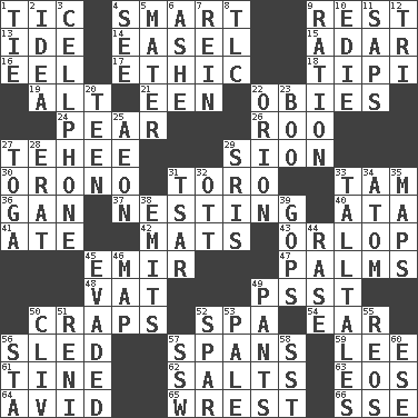 ACROSS 1. Nervous spasm 4. Don Adams' spy role 9. Respite 13. Binary compound 14. Artist's stand 15. The sixth month of the Jewish calendar 16. Snakelike fish 17. Moral principle 18. Native american tent (variation) 19. Keyboard modifier key 21. Car or cant ending 22. Off-Broadway awards 24. Lightbulb-shaped fruit 26. Friend of Pooh 27. Giggle 29. The Jewish people; Israel 30. U. of Maine site 31. "Corrida" creature 33. Scottish cap 36. Separate the seeds from cotton 37. Snuggling 40. "One Day ___ Time" 41. Had dinner 42. Floor protectors 43. Fourth or lowest deck 45. Independent ruler or chieftain 47. Insides of hands 48. Large container 49. Inconspicuous attention getter 50. Dice game 52. Health resort 54. Ewer handle 56. Downhill vehicle 57. Connects, as a bridge 59. Area sheltered from the wind 61. Prong on a fork 62. Table seasonings 63. Greek goddess of the dawn 64. Enthusiastic 65. Obtain by seizing forcibly or violently 66. Compass dir. DOWN 1. Standoff 2. The content of cognition 3. Portable communications device 4. Observe 5. Mother 6. American tennis player Robert 7. It's straight from the horse's mouth 8. Affectionate concern, for short 9. Food allowance for one day 10. Singer Brickell 11. Plant excrements 12. Three (prefix) 20. Adolescent 22. Constellation of myth 23. Oct. 31 cry 25. A really long time 27. Ancient Roman robe 28. Part of Q.E.F. 29. Indian titles of respect 31. Russian ruler of old 32. Baseball player Mel 33. Baron Munchausen's specialties 34. Tiny particle 35. Atlas contents 38. Gives off 39. Republicans 44. To erase 45. Dodged 46. Atlas unit 49. Leg coverings 50. 154 in Roman numerals 51. Painter Guido (1575-1642) 52. Practice fight 53. Light colored 55. Vintage cars 56. R.R. building 57. Compass dir. 58. Fast jet (abbr.) 60. Compass dir.